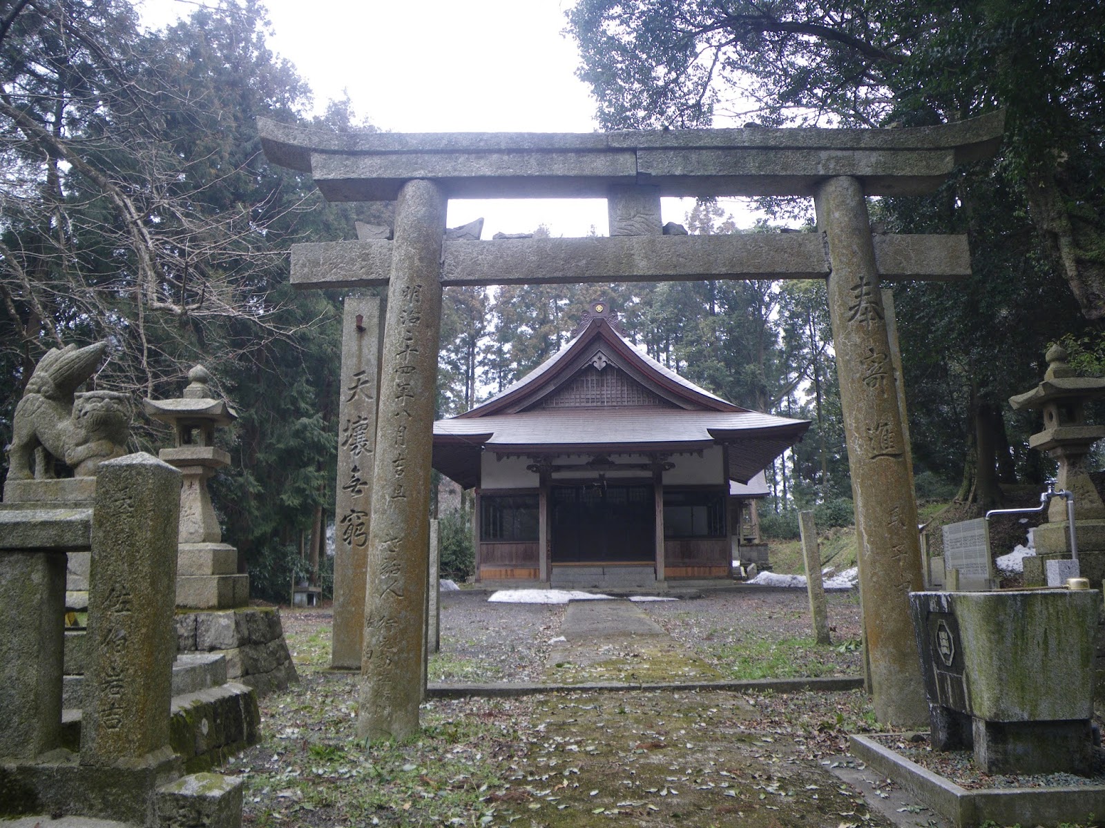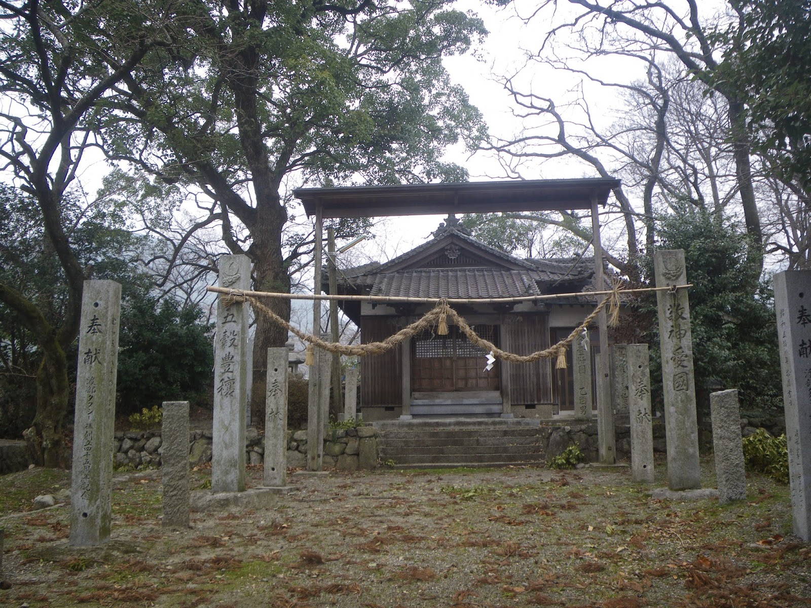 旧千原小学校の校舎下に立派な社。五社大明神とある、祭神は素盞鳴命(すさのをのみこと)、保食命(うけもちのみこと)、稚日女命(わかひるめのみこと)、伊邪那岐命(いざなぎのみこと)、伊邪那美命(いざなみのみこと)。稚日女命は、日本書紀では天照大神の妹とされ、高天原で織折りをしているとき、素盞嗚尊が馬を投げ込み、それが原因で亡くなってしまう。それを悲しんだ天照大神が天岩戸に隠れたとのこと。古事記には登場しないようである(Wikipedia)。境内にはムクノキ・イチョウ・ハナゴの巨樹が残る。