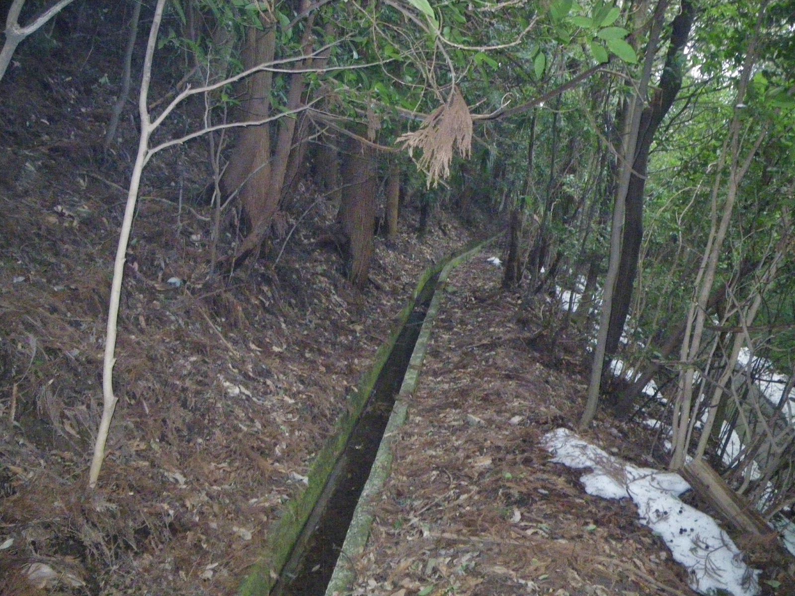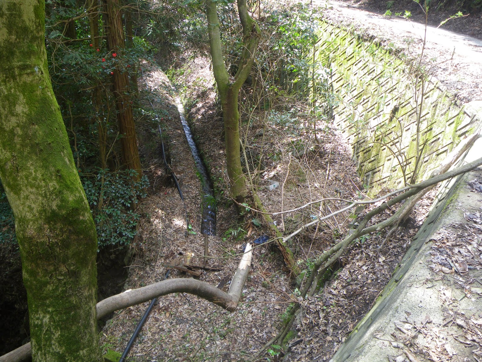 隧道出口からの水路に沿ってふたつの沢を横断し先に進む。水路はさきほど歩いてきた道に沿って進み、その比高差が次第に減ってゆく。そしてしばらく進むと水路が道とクロスし、そこからは水路は山側に移る。ここを歩いてきたのだが、全く気がつかなかった。