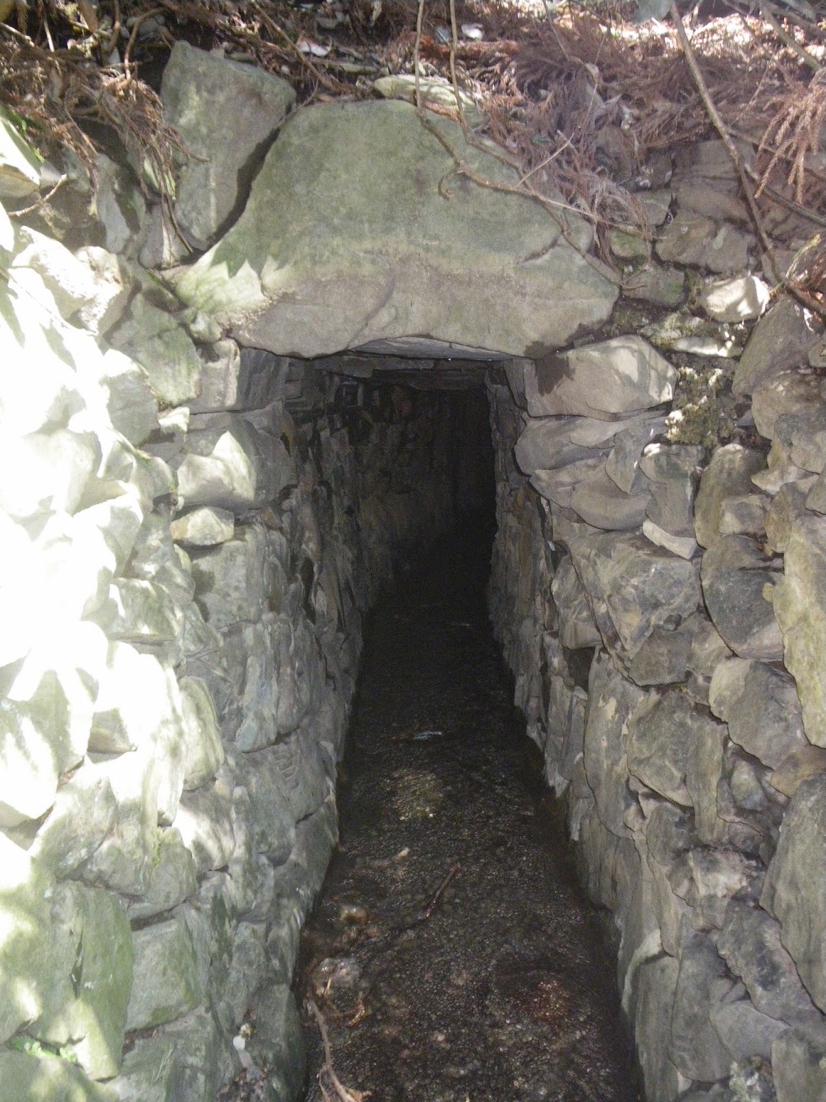 取水口からは川沿いの石組の水路、山中に入ると地面を掘割った水路を辿ると関屋切抜水道の隧道入口が現れた。