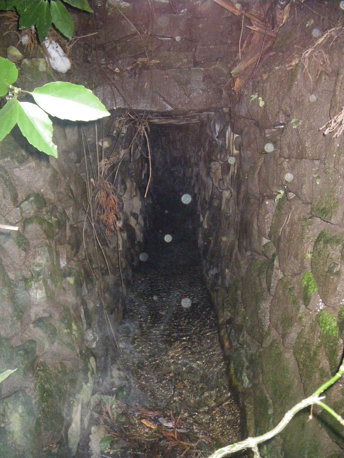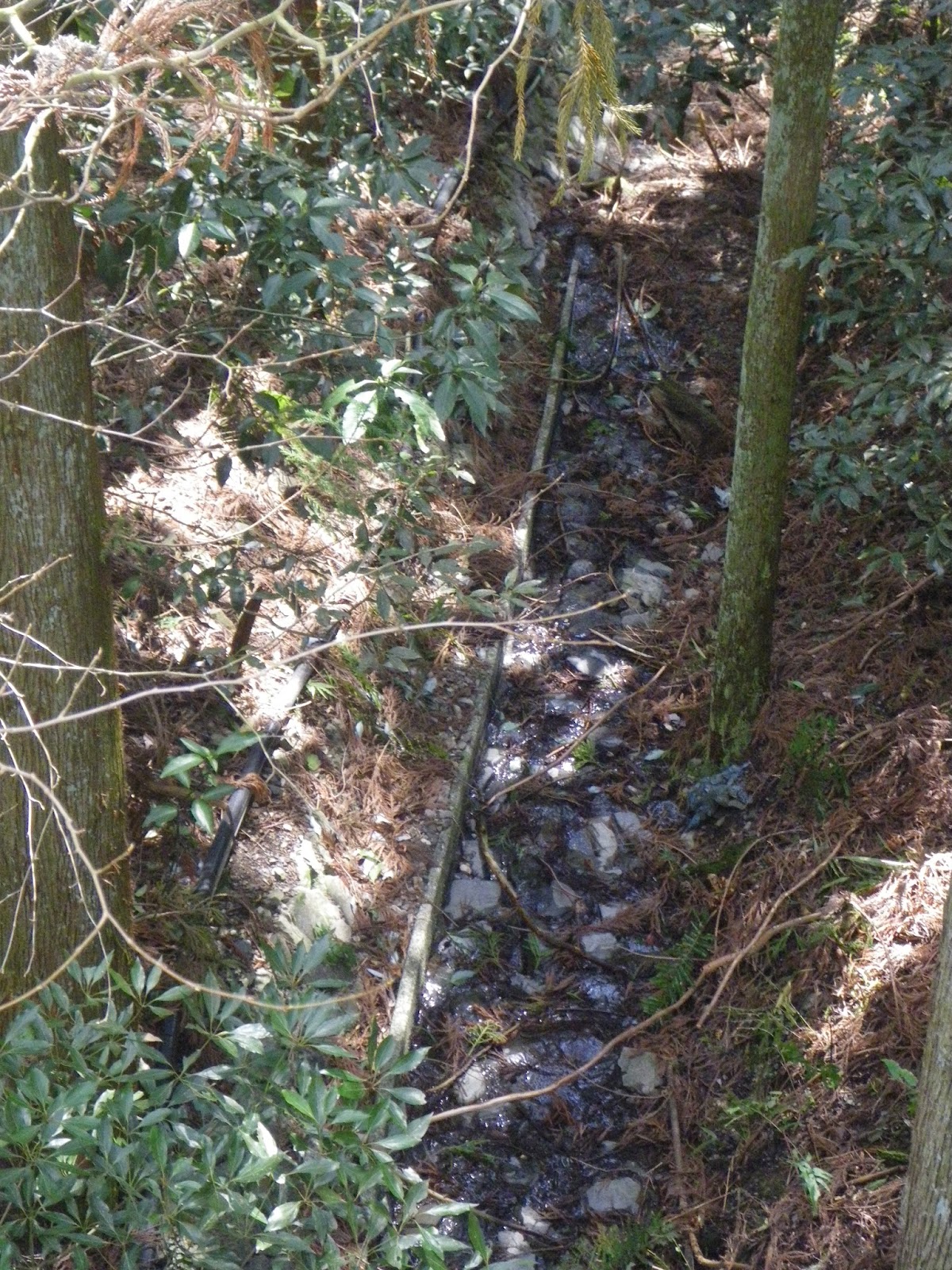 水路がわからなければ、沢にかかる数メートルの橋があり、そこから水路溝といった造りが見えるので、それを目安に辿れば出口に当たるとのことでもあった。また、隧道の入口は二つの支流の南側の沢にあるとのこと。