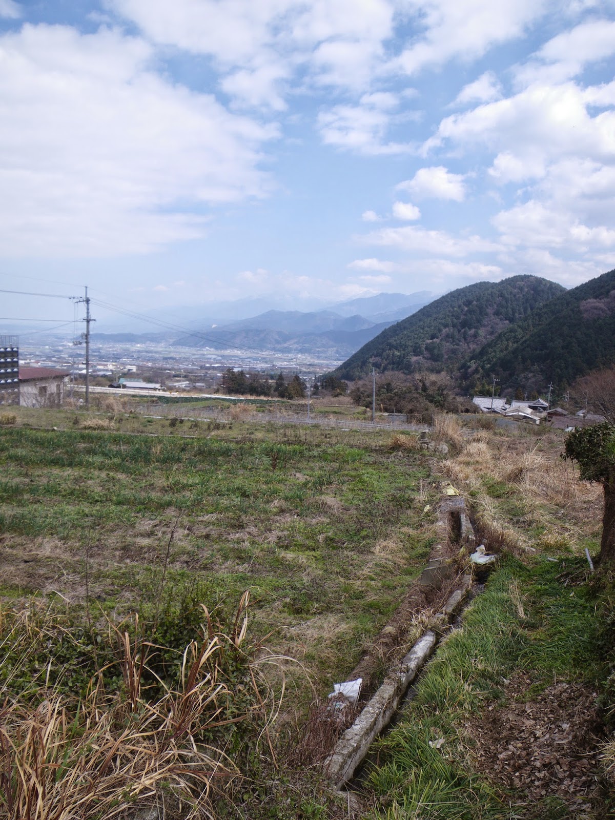 水路に沿って下ると萬福寺の境内前。そこから更に傾斜のある耕地を水路に沿って里に下り、今度は隧道入口探しに出かける。