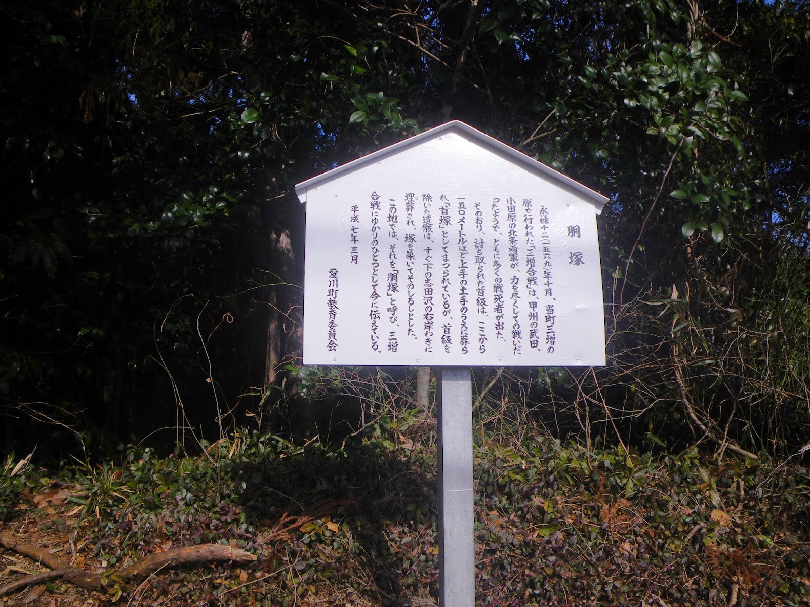 この戦いのあと、戦死者の首を葬ったといわれるのが首塚であり、県道を隔てた森の中には胴を葬ったという胴塚がある。なお、三増合戦での戦死者は北条方3269人、武田方900人と伝えられる」とあった。