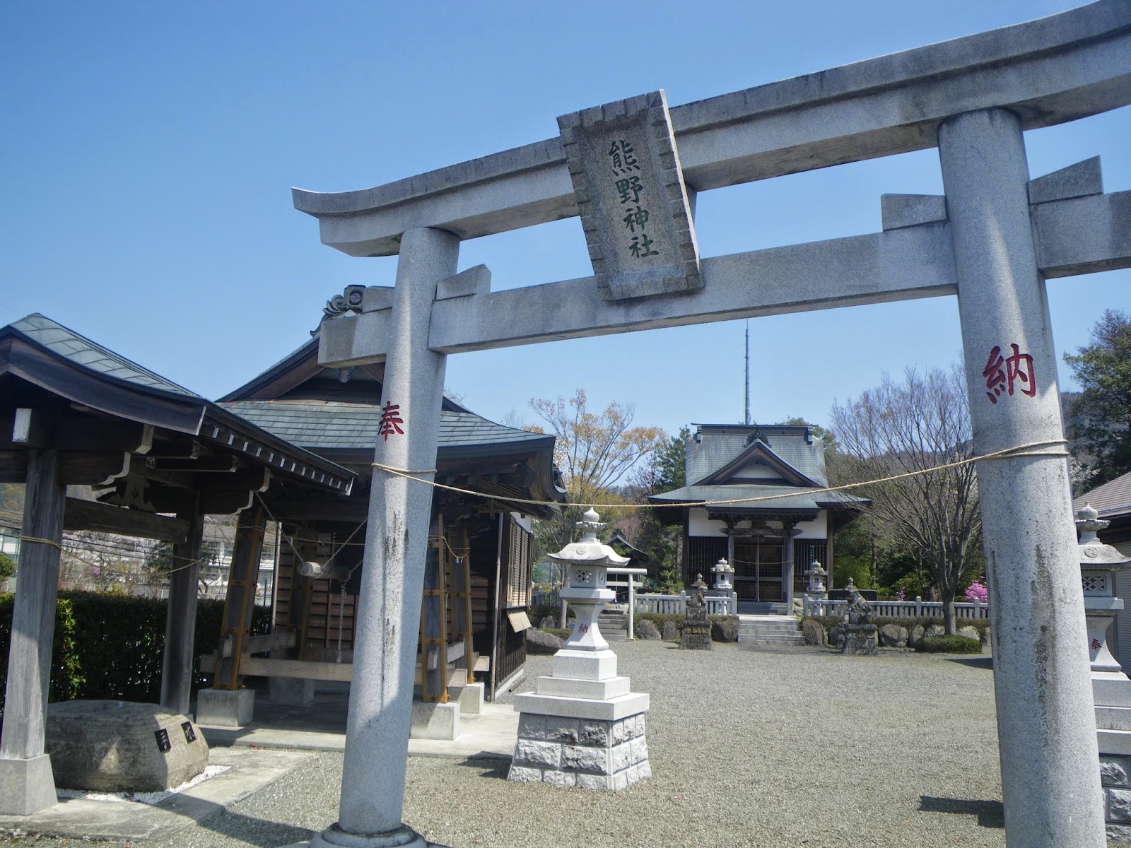 やまびこ橋を渡り、中津川左岸に渡る。県道沿いに熊野神社。水没した北集落にあったものを移したもの。祭神は伊弉諾命( いざなぎのみこと ) 、伊弉冊命 ( いざなみのみこと )。摂末社の八坂神社は須佐男命 ( すさのおのみこと ) を祀る。その他大六天社も。