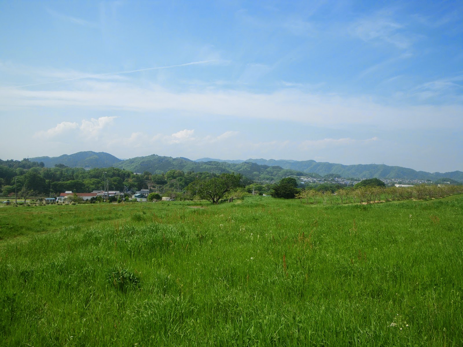 串川の谷底低地に向かって緩やかに下る山間に広がる平坦な地を下る。平坦な地の西端に、途中から唐突に谷筋が現れるが水は無い。左右、南北の景観を眺めながら串川の流れる谷底低地に下り道場の集落に。