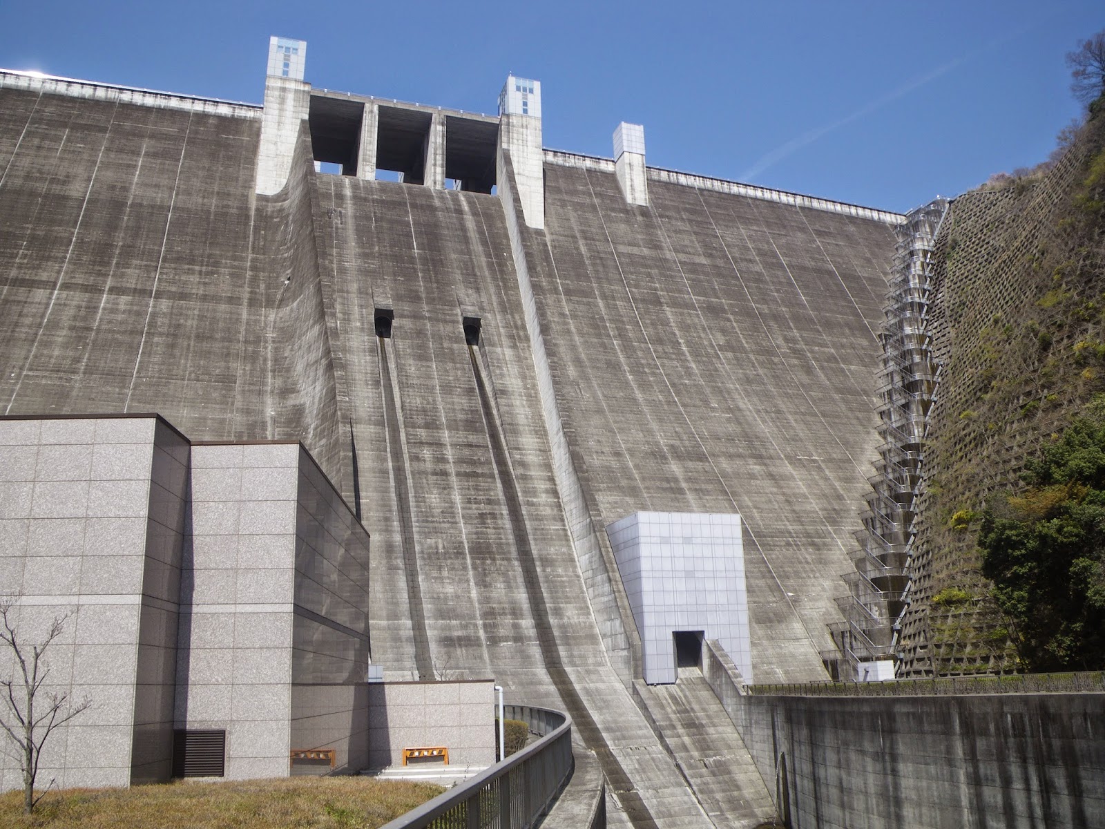 愛川第一発電所脇を進みダムの直下に。堤高156mはさすがに圧倒的。ダムを見上げると上部と低部に「吐口」が見える。案内によると、上部の吐口(高位常用洪水吐)は洪水時と観光放水時に使用するゲート。低位(低位常用洪水吐)の吐口は急速に水位を低下する場合に使用される,とあった。