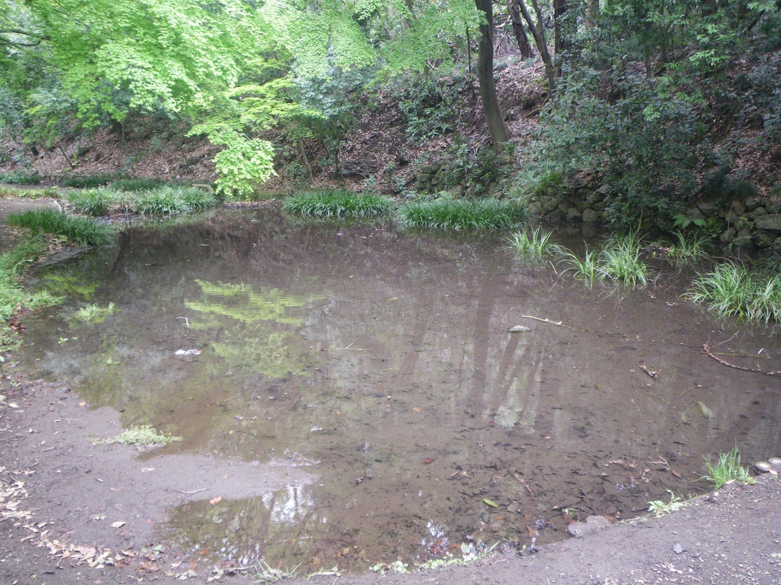 大堀に沿って崖下の道を南に進む。しばらく進むと車止めがあり、その先は草むした簡易舗装の道となる。この車止めまでに2カ所ほど下水のマンホールがあった。そのどちらかが烏山用水(新堀)が「雨水下水」として終末処理場に流れるポイントではあろうが、開渠水路は見あたらず、どちらが新堀(烏山用水)の末流か判別できなかった。