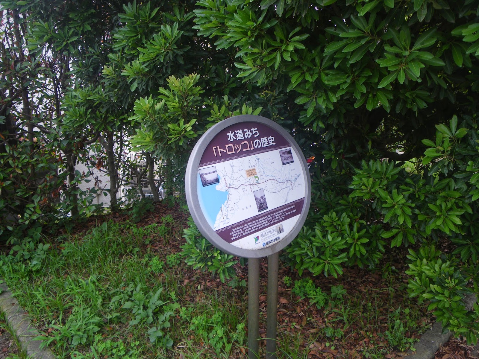 公園内の導水路が通っているではあろう歩道を歩くと道脇に「水道みち トロッコの歴史」の案内。三井用水取水所から25.5キロ、13番目の案内板である。