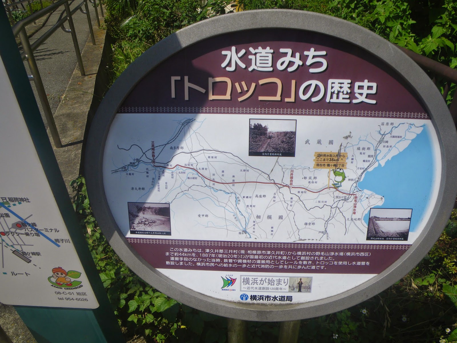 近代水道の要ともなる水路管(グラスゴーから輸入)の運搬には、相模川を船で運び上げたり、陸路にはトロッコ線路を敷設し水管を運び上げたとのことである。現在三井の取水所跡から旧野毛山配水池(大正12年(1923)の関東大震災で被災し、配水池となる)まで26個の「トロッコ道」の案内板が整備されている。これが創設期の「横浜水道みち」ではある。