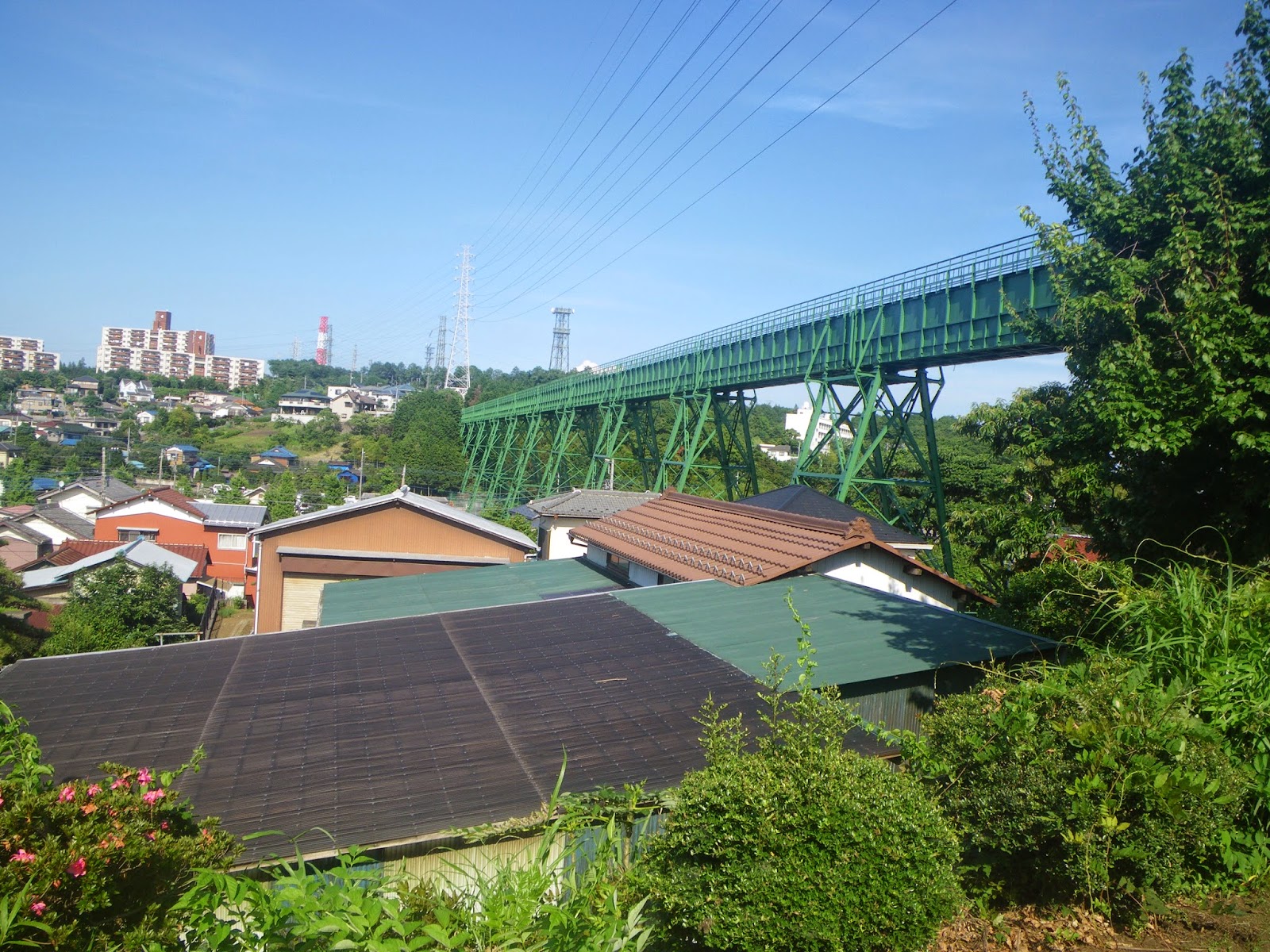 昭和27年(1952)完成。長さ72m、高さ17.4m。緑にペイントされているのは錆止めのため。お洒落やデザインではないようである。鉄板で覆われた水路橋は、その中に送水管があるわけではなく、その鉄板の中を直に水が流れている、と。