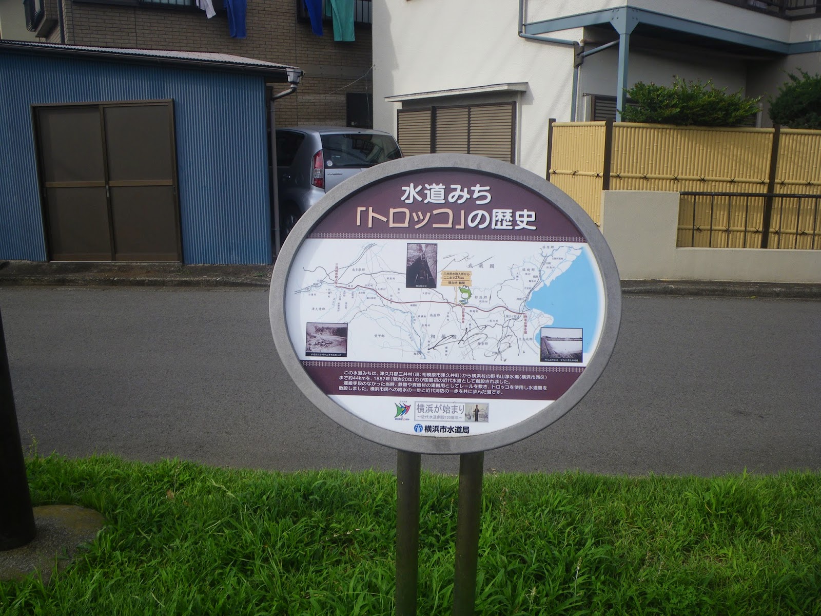 常の案内と同じく、「この水道みちは、津久井郡三井村(現・相模原市津久井町)から横浜村の野毛山浄水場(横浜市西区)まで約44kmを、 明治20年(1887)わが国最初の近代水道として創設されました。 運搬手段のなかった当時、鉄管や資機材の運搬用としてレールを敷き、トロッコを使用し水道管を敷設しました。 横浜市民への給水の一歩と近代消防の一歩を共に歩んだ道です(横浜市水道局)」とある。