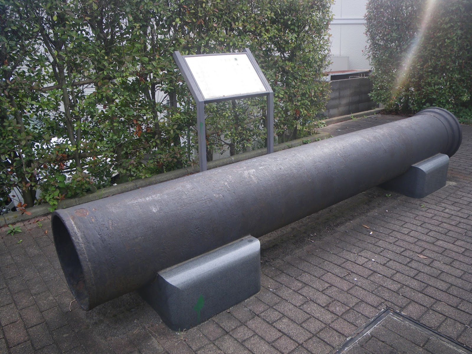 その案内の脇に大きな鉄管と案内、近代水道創設時の鉄管とのこと。