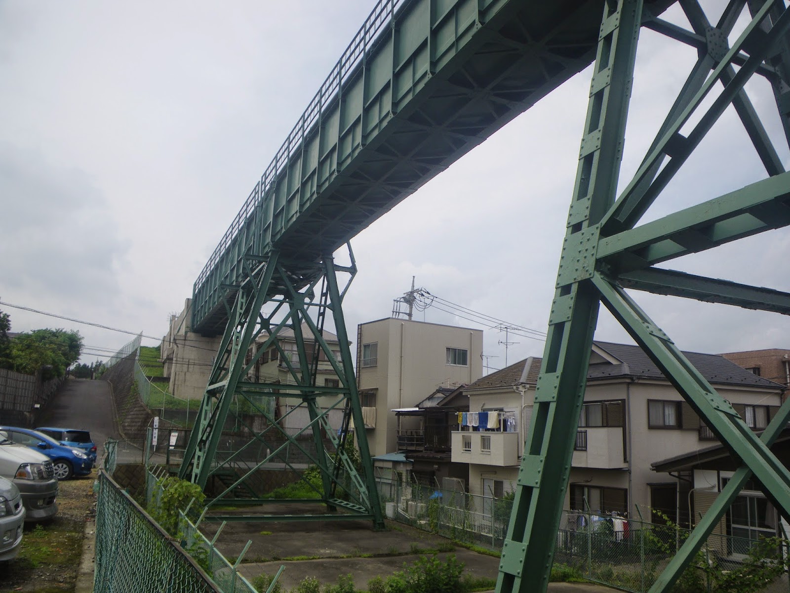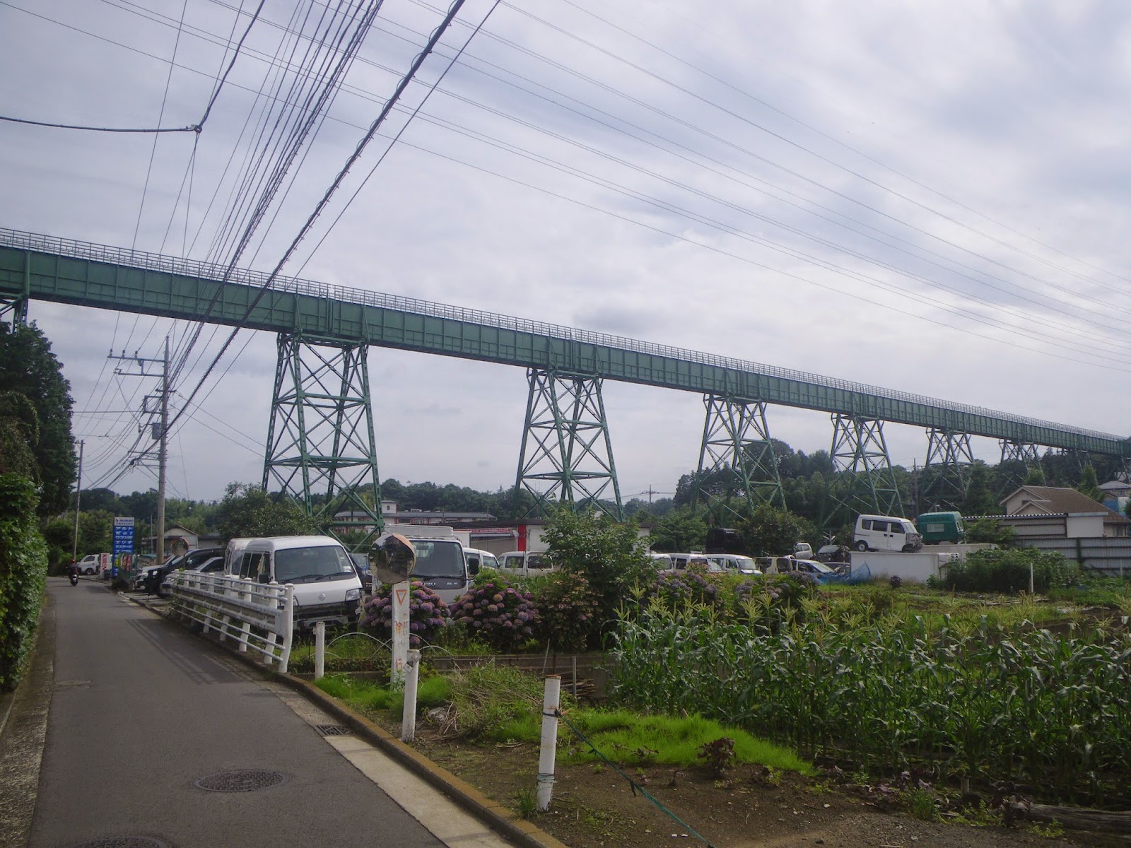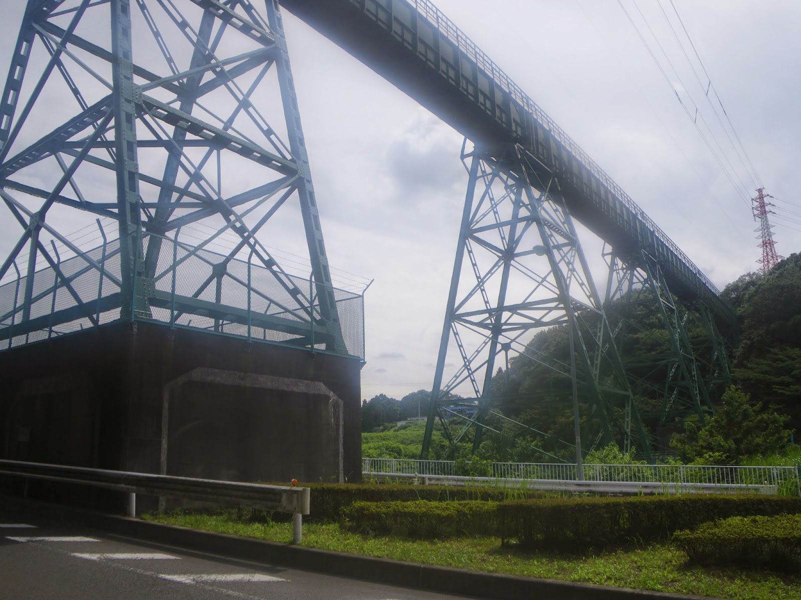 昭和27年(1952)完成。長さ72m、高さ17.4m。緑にペイントされているのは錆止めのため。お洒落やデザインではないようである。鉄板で覆われた水路橋は、その中に送水管があるわけではなく、その鉄板の中を直に水が流れている、と。