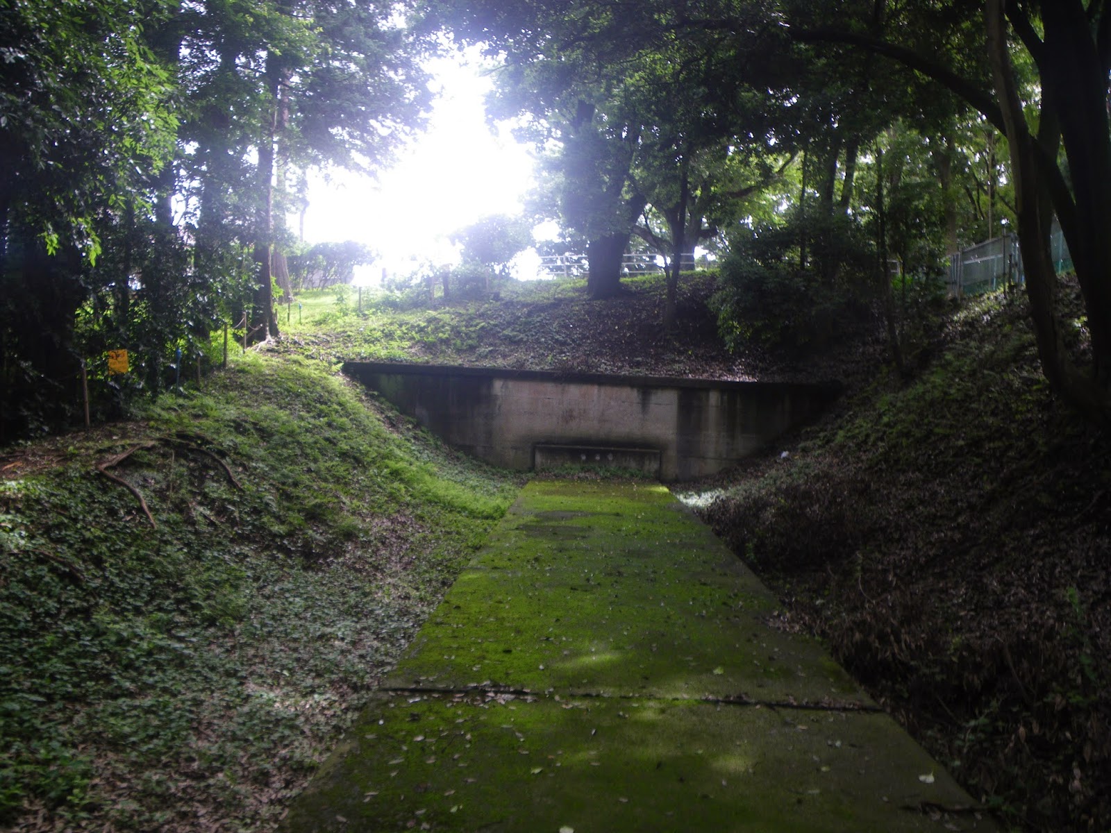 踏み分け道を進むと地中に埋もれていたコンクリートの導水路が次第に姿を現し、ほどなく導水路を支える桁も見える。先に進むと踏み分け道は上りとなり、導水路上を歩けるようになる。右手にズーラシアの動物の鳴き声、ライオンバスなどを見遣りながら進むと轍柵で先を遮られる。