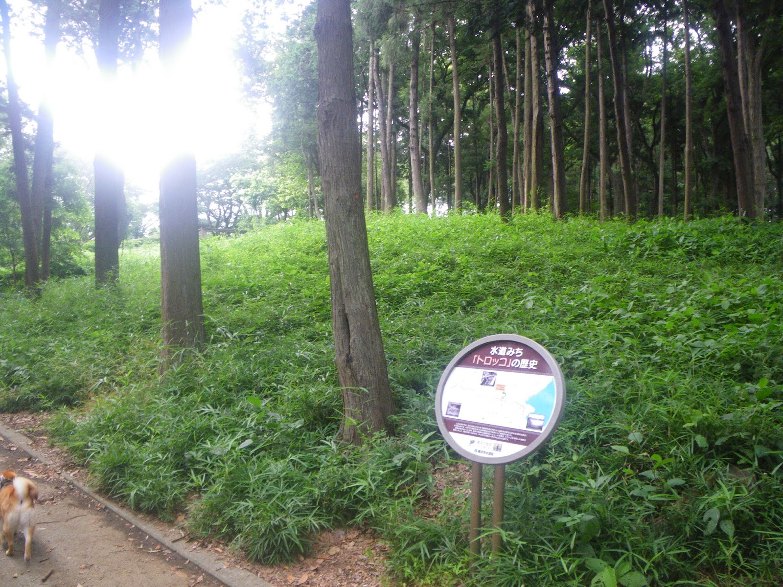 公園内の導水路が通っているではあろう歩道を歩くと道脇に「水道みち トロッコの歴史」の案内。三井用水取水所から25.5キロ、13番目の案内板である。