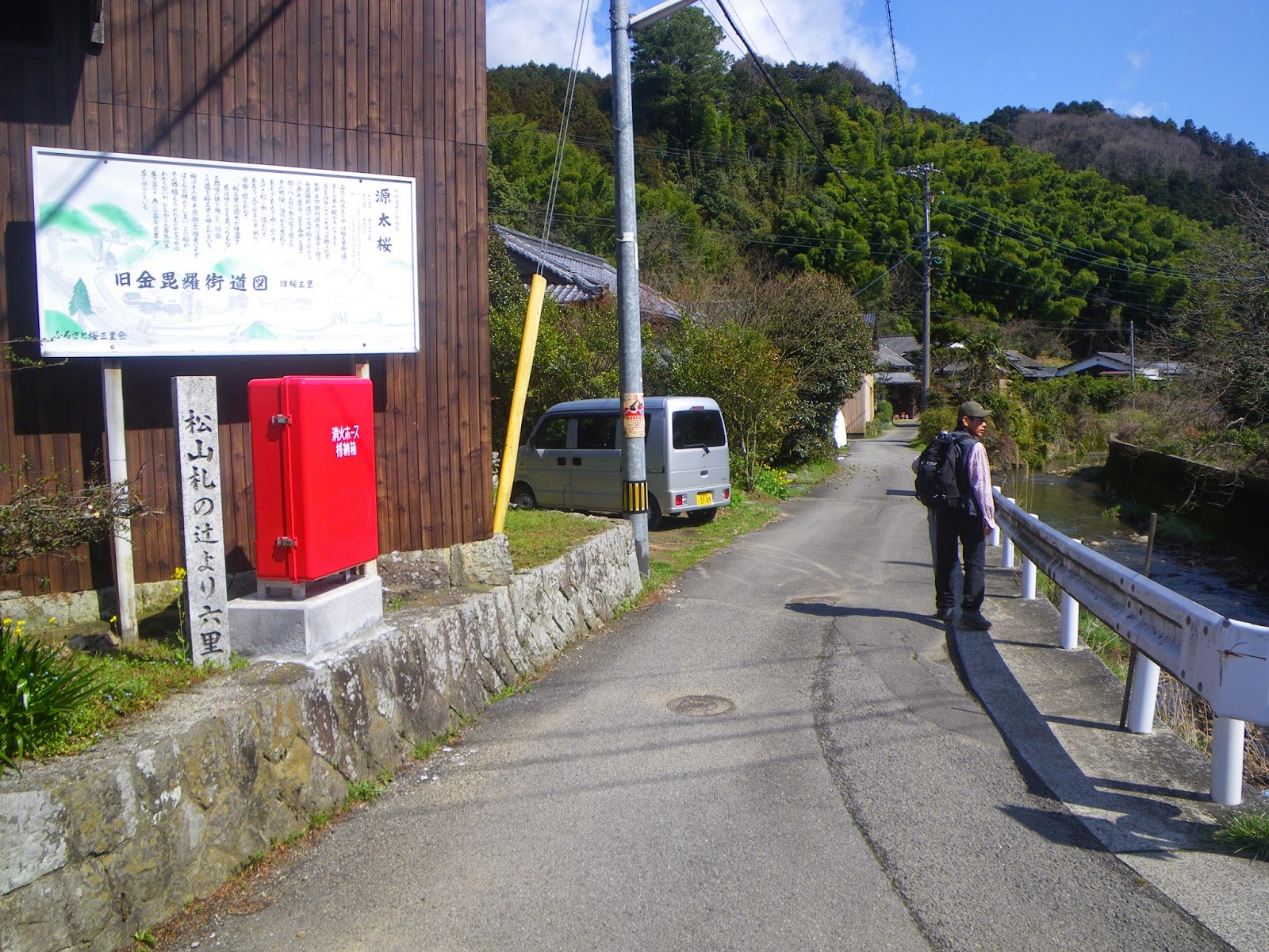 農道といった趣の道を下り土谷集落に。中山川水系の支流に架かる土谷川の手前に「旧金比羅街道図」と「源太桜」の案内と里程標、そして橋の袂に「源太桜 旧金比羅街道1500m」の案内があった。