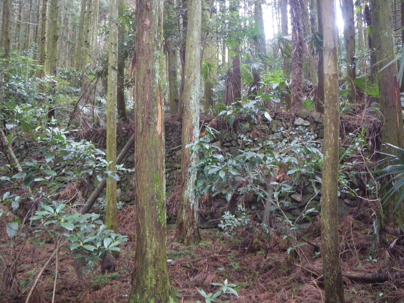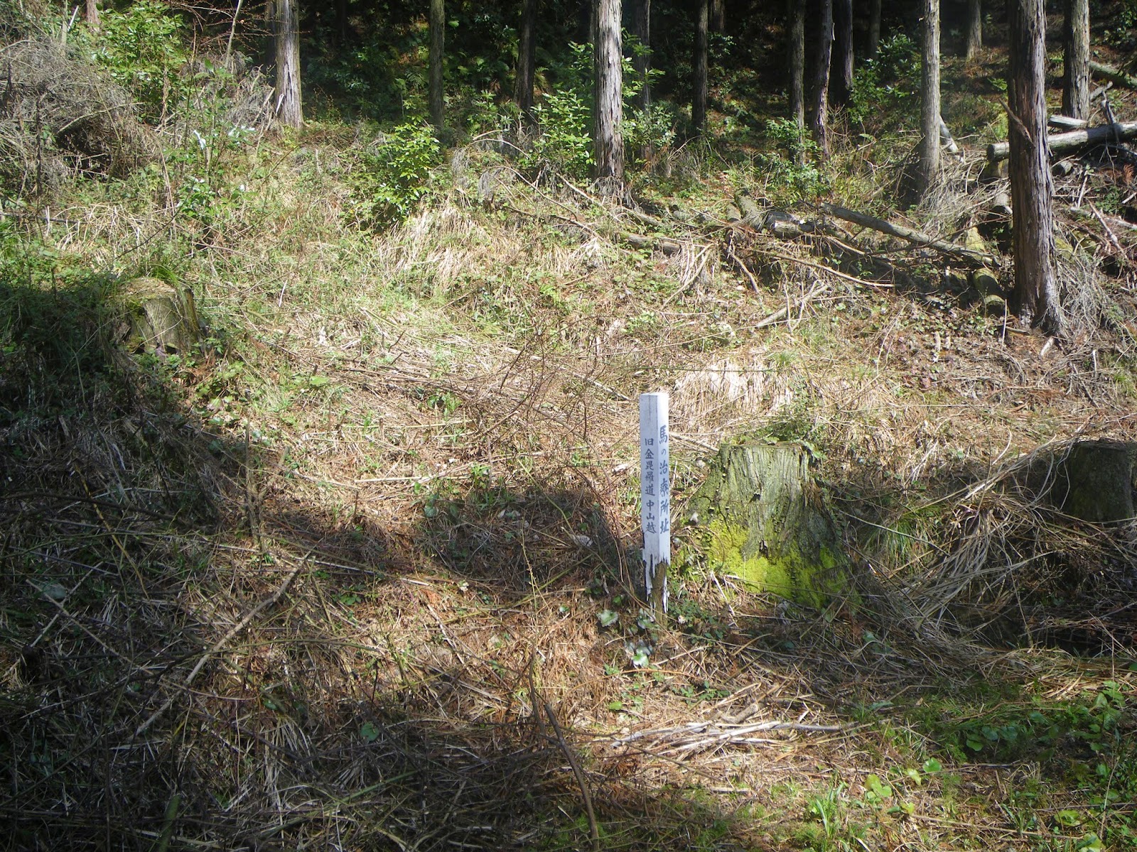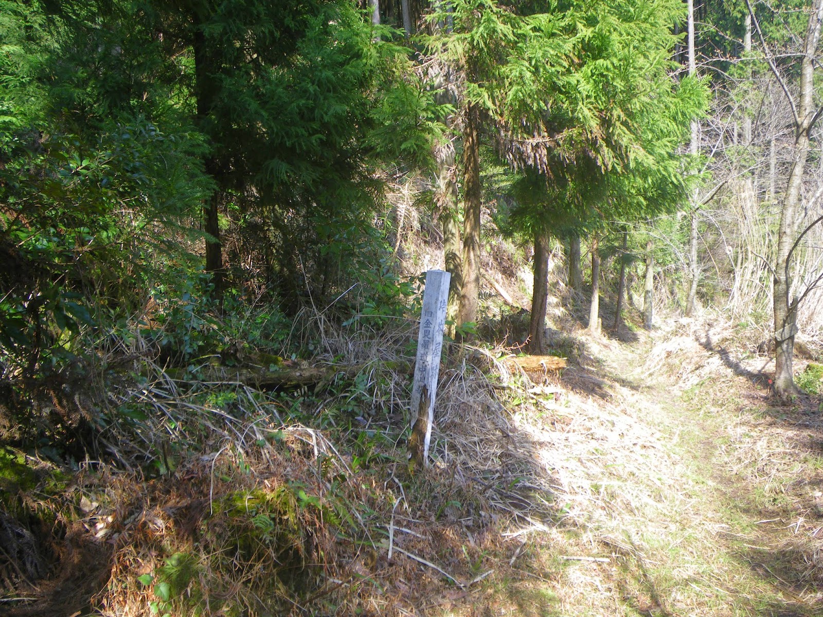 杉林の中、沢に沿ってしばらく北に進むと、右に曲がった辺りの北側に耕地らしきものが見える。この辺りに「松山札辻より六里」の里程石があったようだが、現在は行方不明とのこと。