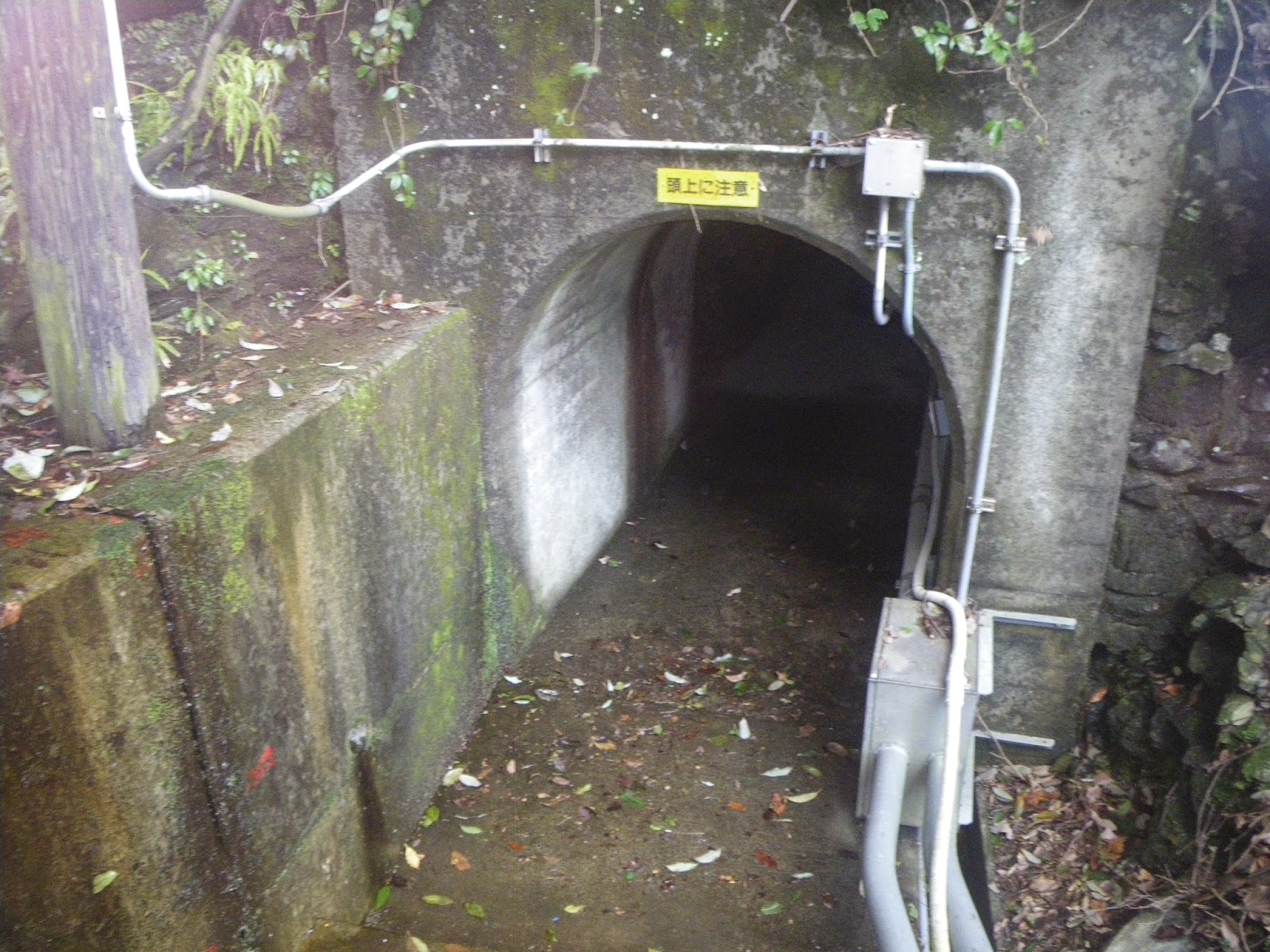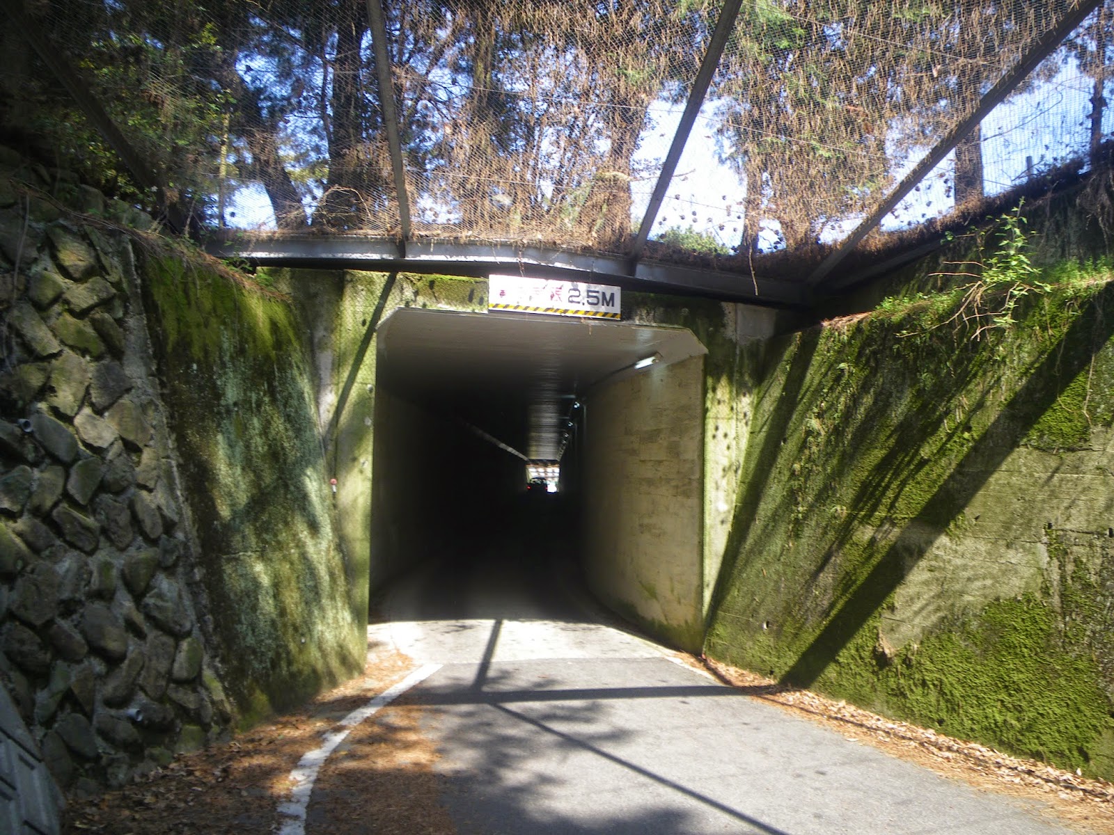 車を進め、松瀬川を渡ったところで、丘陵へと上る道を進む。坂を上り倶楽部ハウスの手前にゴルフコース下を抜いたトンネルがある。金比羅街道はこのトンネル辺りを進むようであるが、如何にも狭い。軽四がかろうじて通れると言ったもの。入口には点燈スイッチがあり、赤と緑のシグナルにより逆側にトンネルに入ることを知らせるようである。