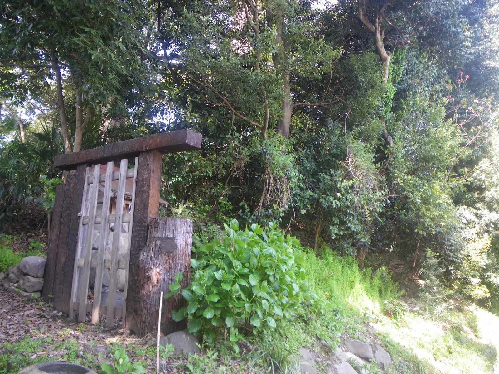 神社の裏に古墳がある、と言う。社殿脇を上り古墳跡に。鬱蒼とした社叢には立ち入ることはできない。案内を簡単にまとめると、「古墳は大正2年に発見され昭和25年県指定の史跡に。墳丘の大きさは約40mと20mの長方形または長円形。高さ約5m。墳丘にはふたつの石室があり、東側は開口されているが、西側は閉ざされている。