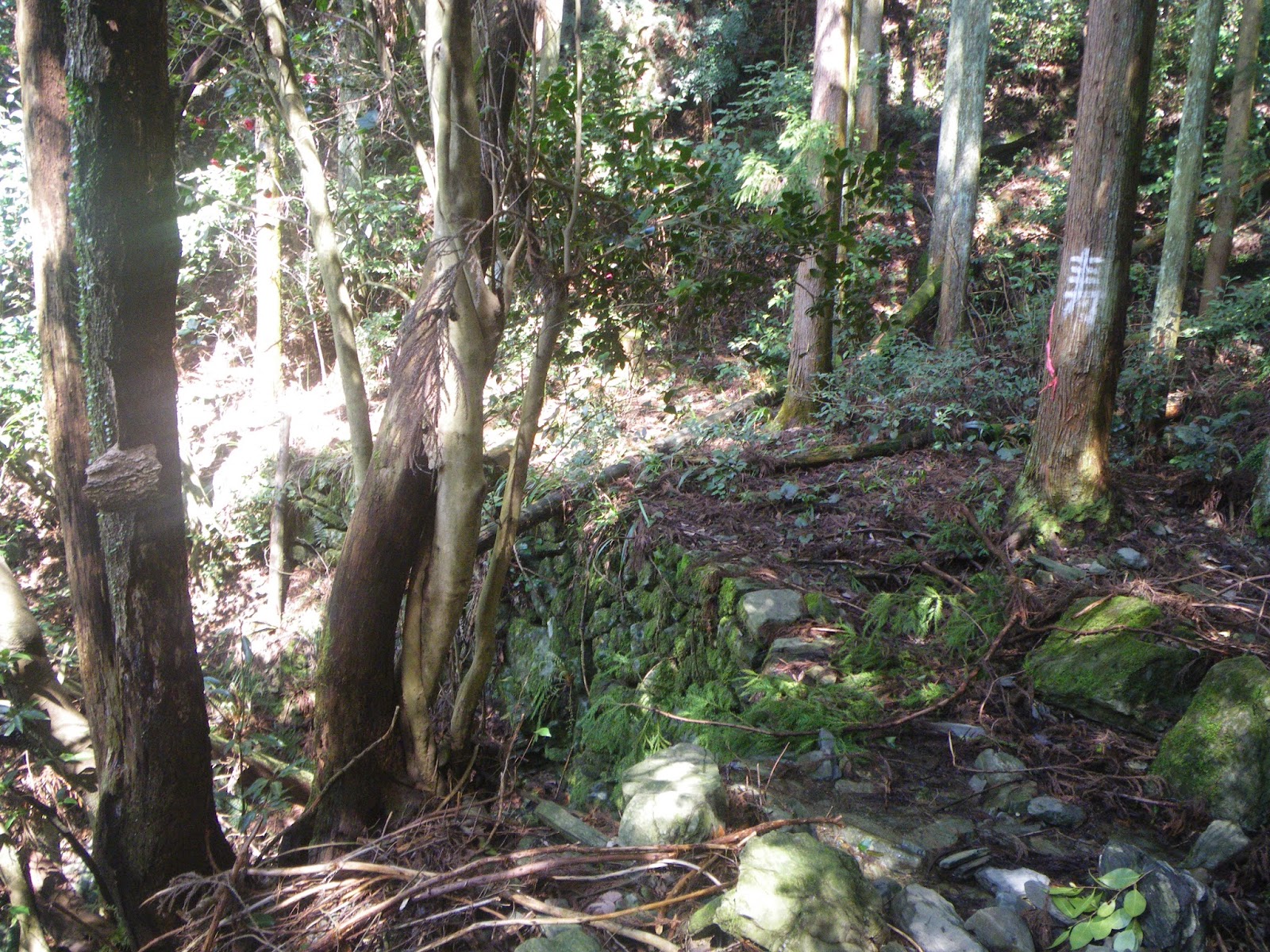 木橋の架かる沢から緩やかに道を下り歩くこと10分ほど、再びしっかりした石垣のある道になる。途中、左手下に国道の車の音も聞こえ、終点が近いことを予感する。
