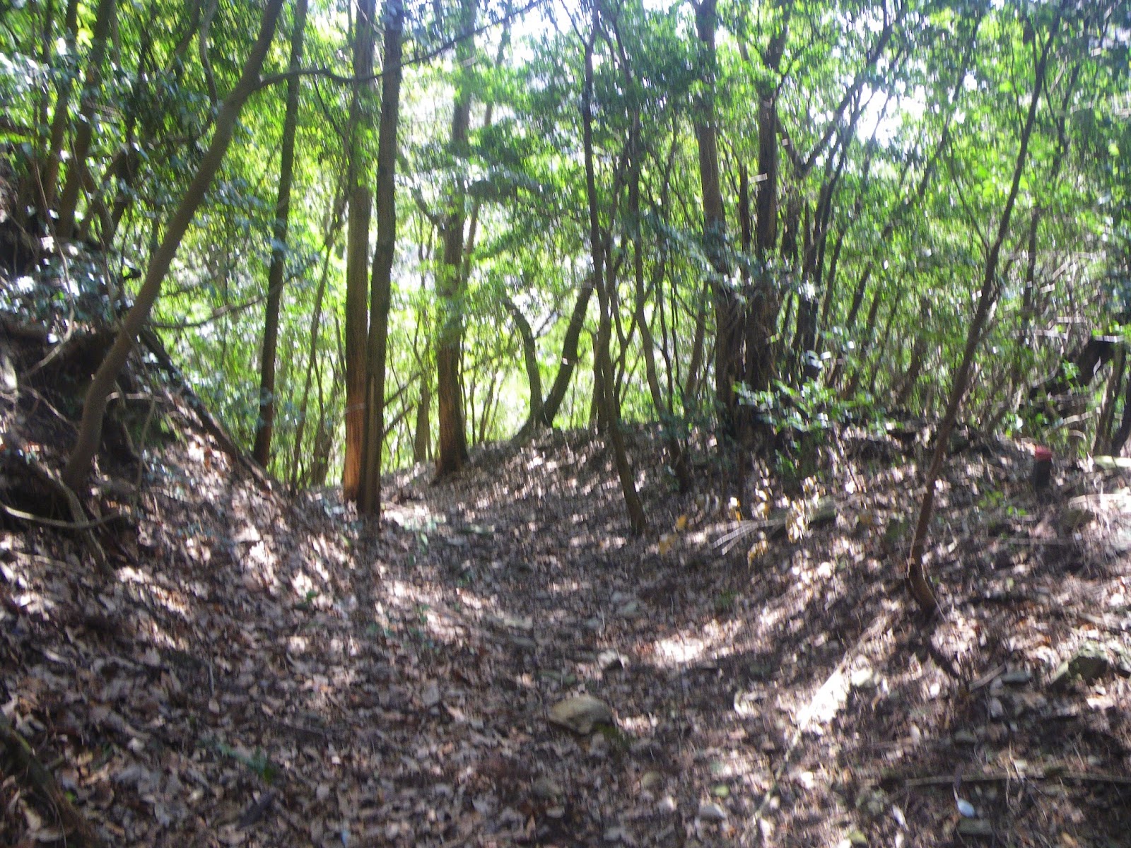 道を遮る竹を潜ったり・折ったりを繰り返しながら5分程度進むと(標高230m)、しっかりした道跡となる。こんな山中に、こんな道幅の広い道は電力会社の作業道とか林業作業者の作業道とも思えず、この道は金比羅街道であることを確信した。
