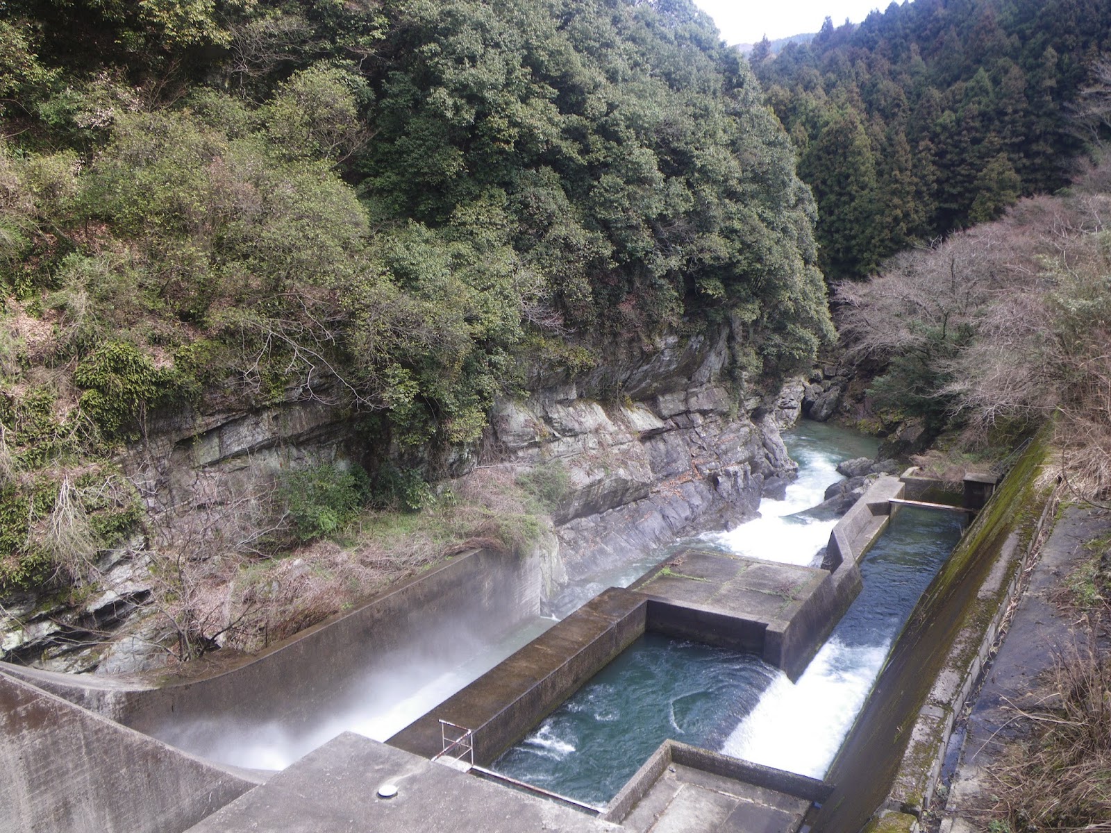 ダムの堰堤から左手を見ると、堰堤から導水路を通り中山川に放水されている。その水は先回散歩した劈巌透水路の少し上流に造られた中山川取水工で取水し、両岸分水工で右岸幹線水路と、左岸幹線水路に分水され道前平野を潤す(詳しくは「伊予・丹原散歩;丹原のの利水史を辿る」をご覧ください)。道後側にはダム湖に造られた千原取水灯で取水され道後平野を潤すことは既に述べた通り。