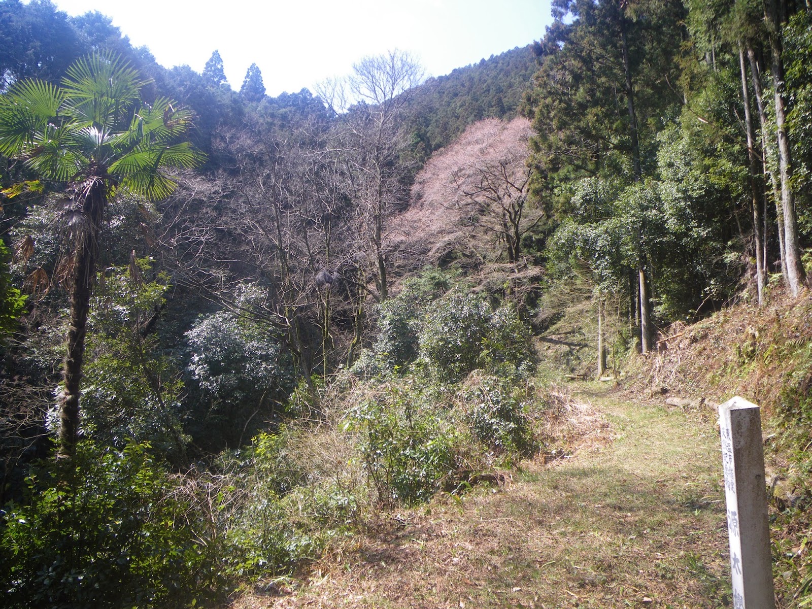 この先、林道は下りとなり、林道の左手に旧道が残る。旧道を進むが、ほどなく再び林道と合流。その地点で再び旧道は林道から離れ山道に入る。ちょっとしたアップダウンを繰り返し、旧カーブする道脇に「順路」の案内。その先は左手が開け源太桜のある盗谷(ぬすっとだに)とも呼ばれる谷に到着する。