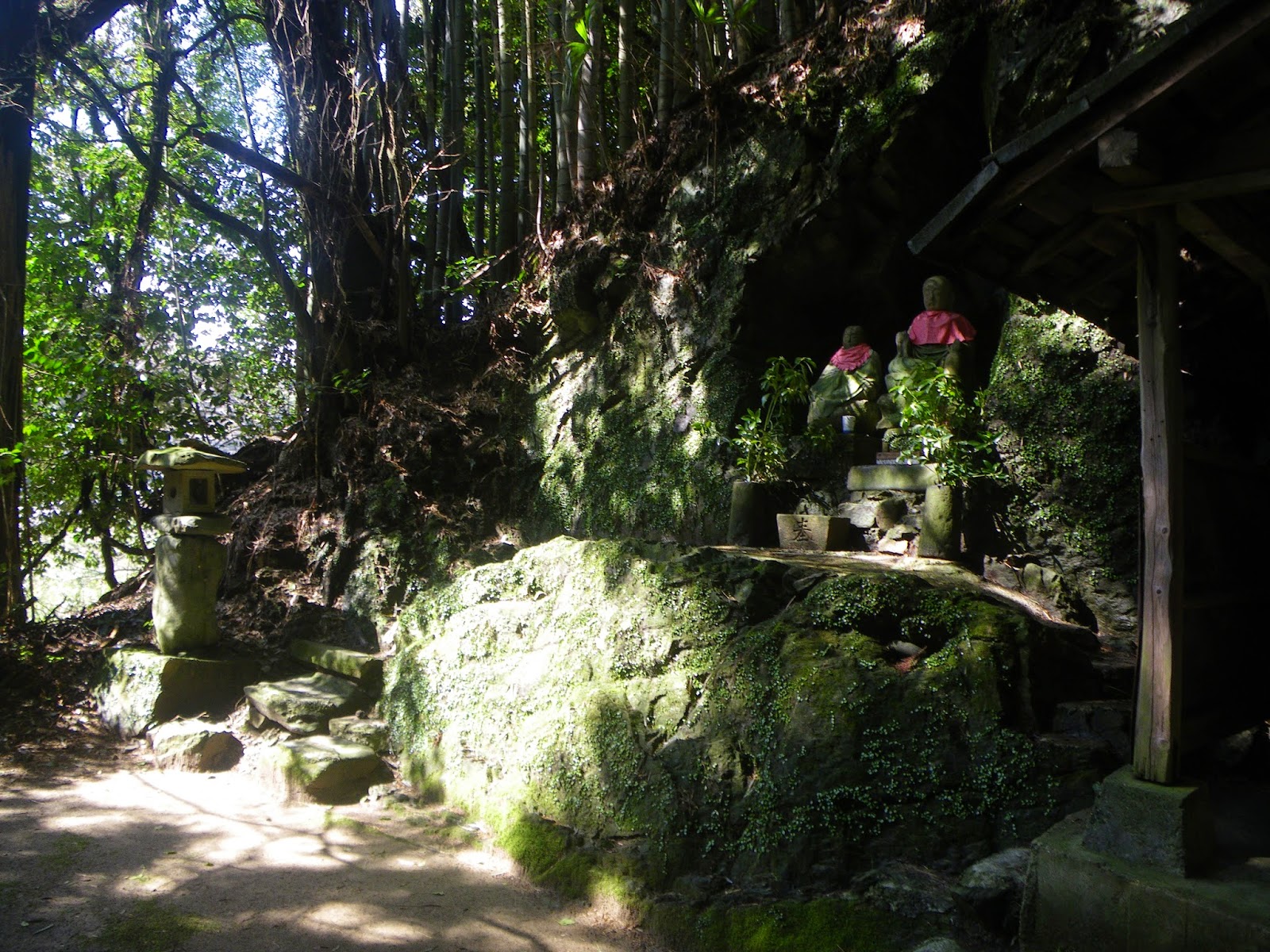 先に進み、山地に入る手前で道はふたつに分かれる。「左こんぴらみち」と刻まれた石碑もある。その石碑の一段上には常夜灯と幾多の石仏。苔むした岩屋に石仏が佇む。祠には千手観音が祀られていた。