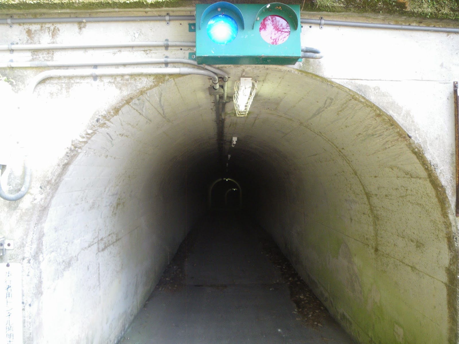 鉄柵に沿って先に進むと階段を上った後、ゆるやかな坂を下り、更に階段を下り、右手にダム湖を眺めながら進むと隧道が現れる。隧道はダムの基礎岩盤を穿つ。スイッチをオンにし、内部の照明をつけ曲がり気味のトンネルを抜けるとダムの堰堤上に出る。