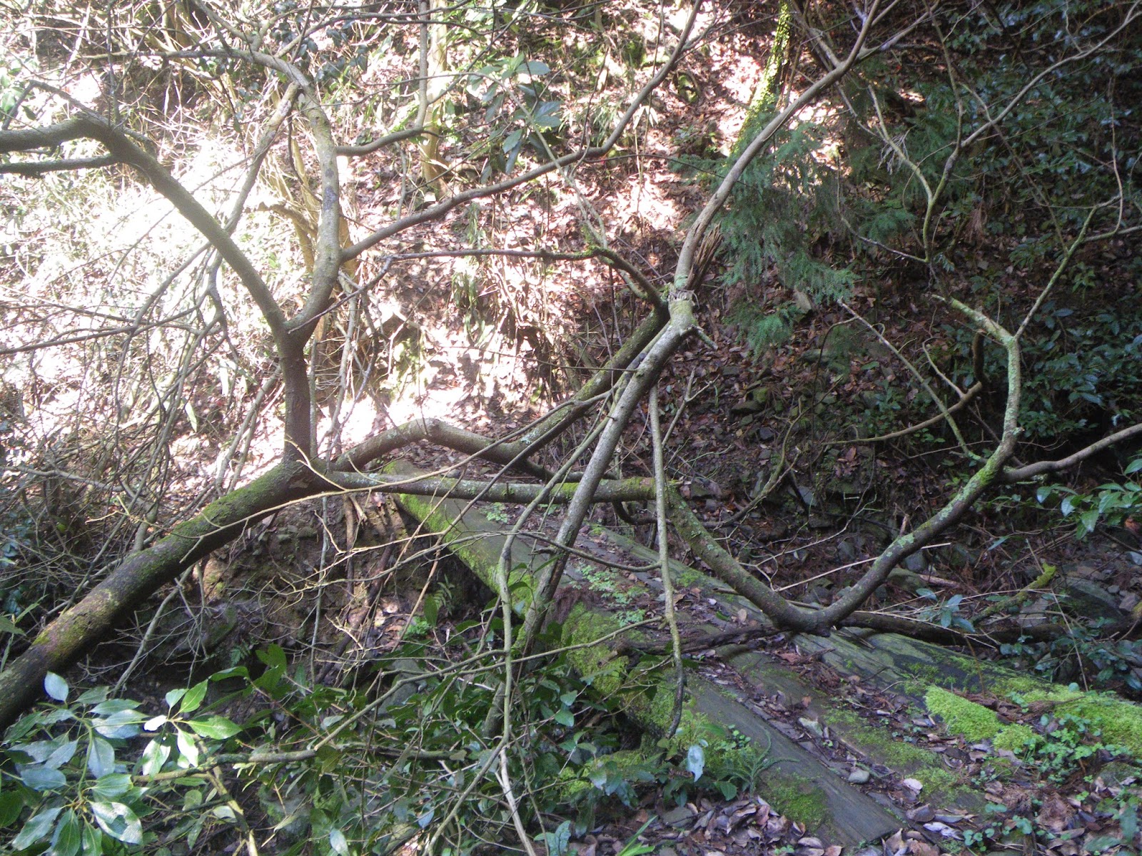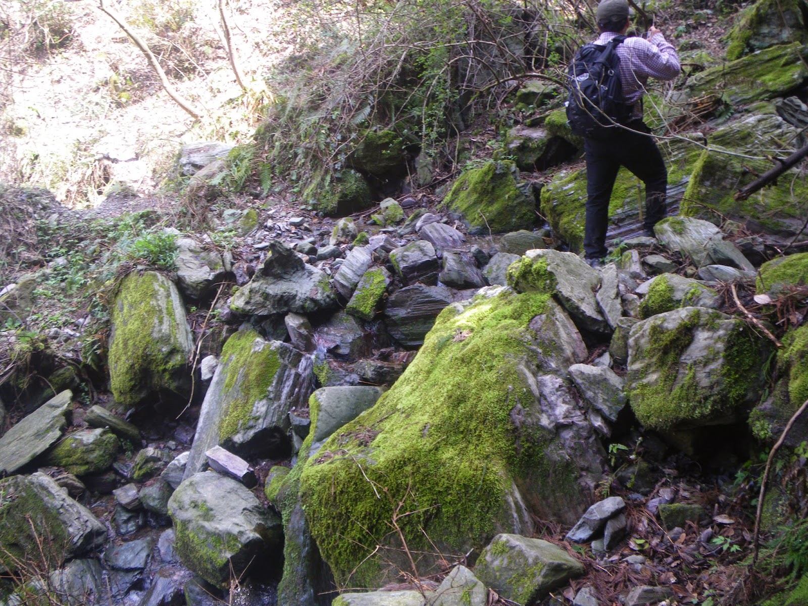 ゆるやかに下る道を10分ほど進む(標高217m)と、道は緩やかに上りとなり、のぼり切ったあたりで沢に出合う。大岩ゴロゴロのガレ場。石組みの道を見付けた辺りからおおよそ15分程度であった。