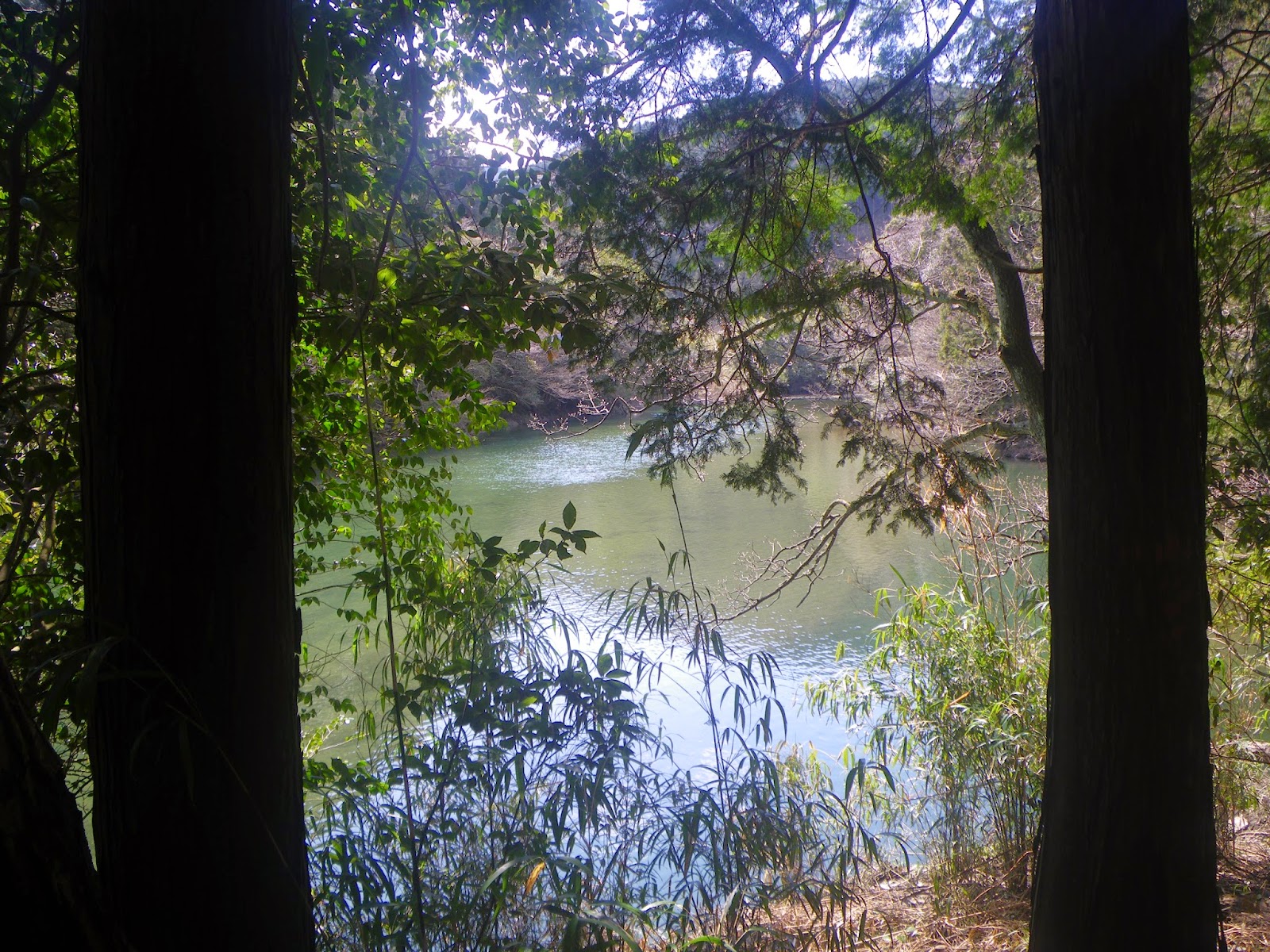 狭いちょっと急な下り坂を進むとダム湖の紺碧の水が右手に見えてくる。「為馬菩提地蔵」から5分強のところに「曙橋」の案内があったようだが、見逃した。曙橋は此の辺りにあったとも、「為馬菩提地蔵」の辺りとも云われる。