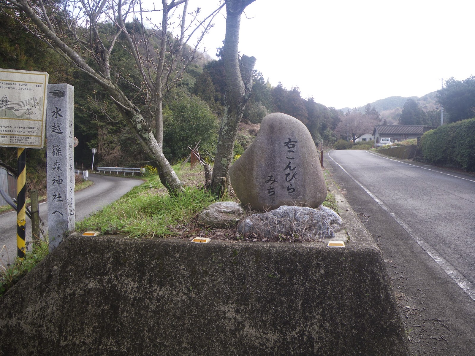 県道を更に進むと、道が分かれ、その分岐点に「右 こんぴらみち」と刻まれた丸い石がある。石は古き趣はなく、最近造られたもののように見える。その裏手、県道から左に分かれる道には「水越 篠森神社へ」と刻まれた石碑が建つ。