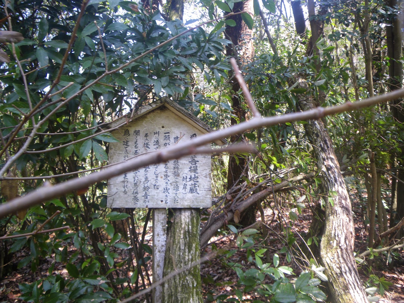 源太桜を後に道を進むと、ちょと下りとなる。その下り口に「為馬菩提地蔵」の案内。案内には、「為馬菩提地蔵(対岸);昔、馬を数珠繋ぎで追っていた。一頭が流されると次ぎ次ぎと川に流され死んでしまった。その後ここを通ると馬の鈴音が聞こえる。その為、流された馬の供養のために建てられたものと云われる」とあった。