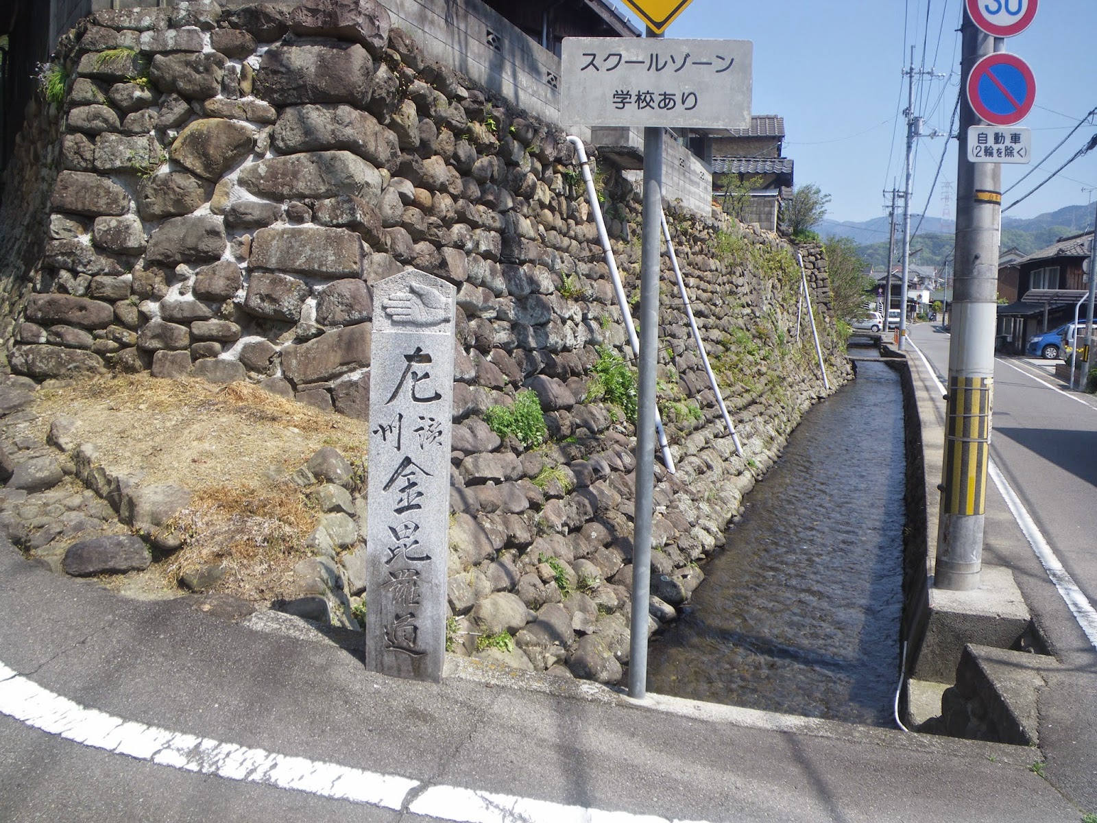道を進むと分署坂があり、道は二手に分かれる。分岐点には石碑があり、「左讃州金毘羅道 従大門廿七里」と刻まれる。金比羅街道はこの分岐点をり手に分署坂を上るが、水路に沿って続く石垣が気になりちょっと寄り道。