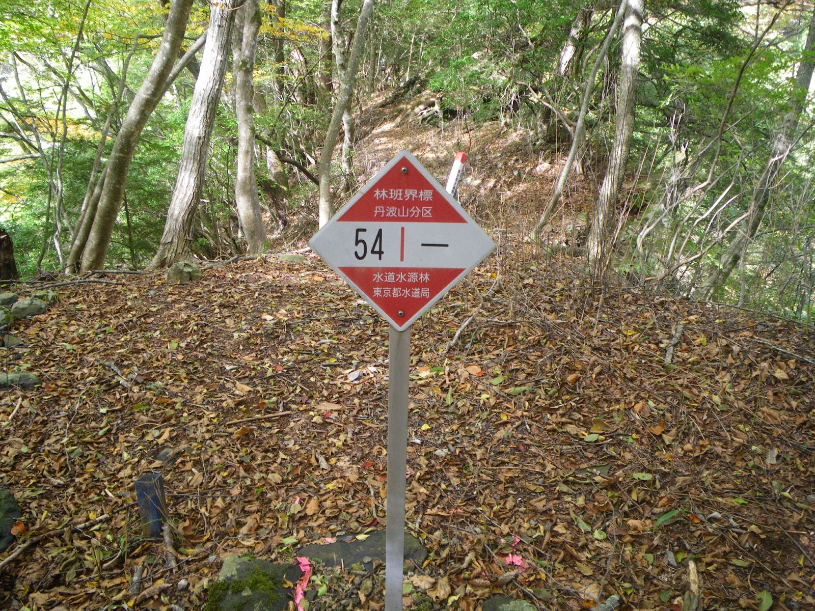 「林班界標」とは森林管理のための境界区分を示すもの。おおよそ50ヘクタール内となるように尾根筋、沢筋を元に区切りをしているようである。「54の右手には55なのか、53なのか、といった数字はないが、右手は丹波川であるため数字はないのだろう。山に入っていけば「54|55」などといった林班界標はあるのだろう。