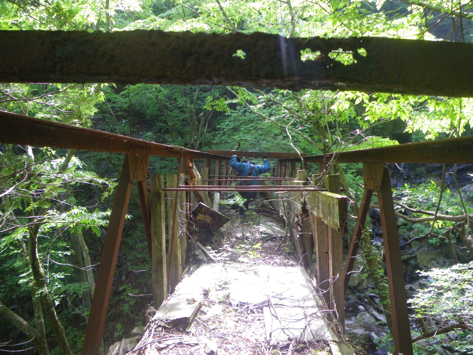 で、車で「空気」を運んでももったいということで、仲間に声を掛け4名のパーティで出かける。うち一人は山歩きがはじめて。崩壊箇所が少々心配ではあるので、念のためロープを用意し廃道散歩に出かける。