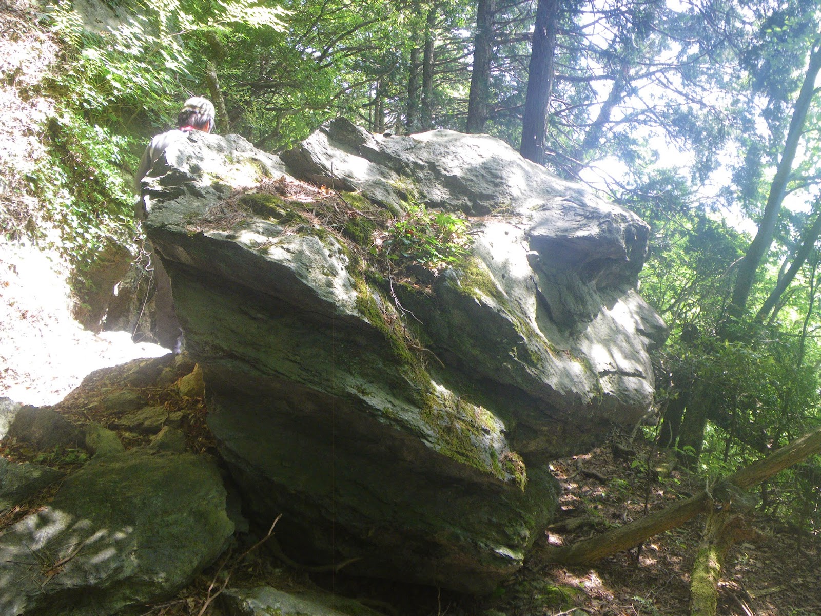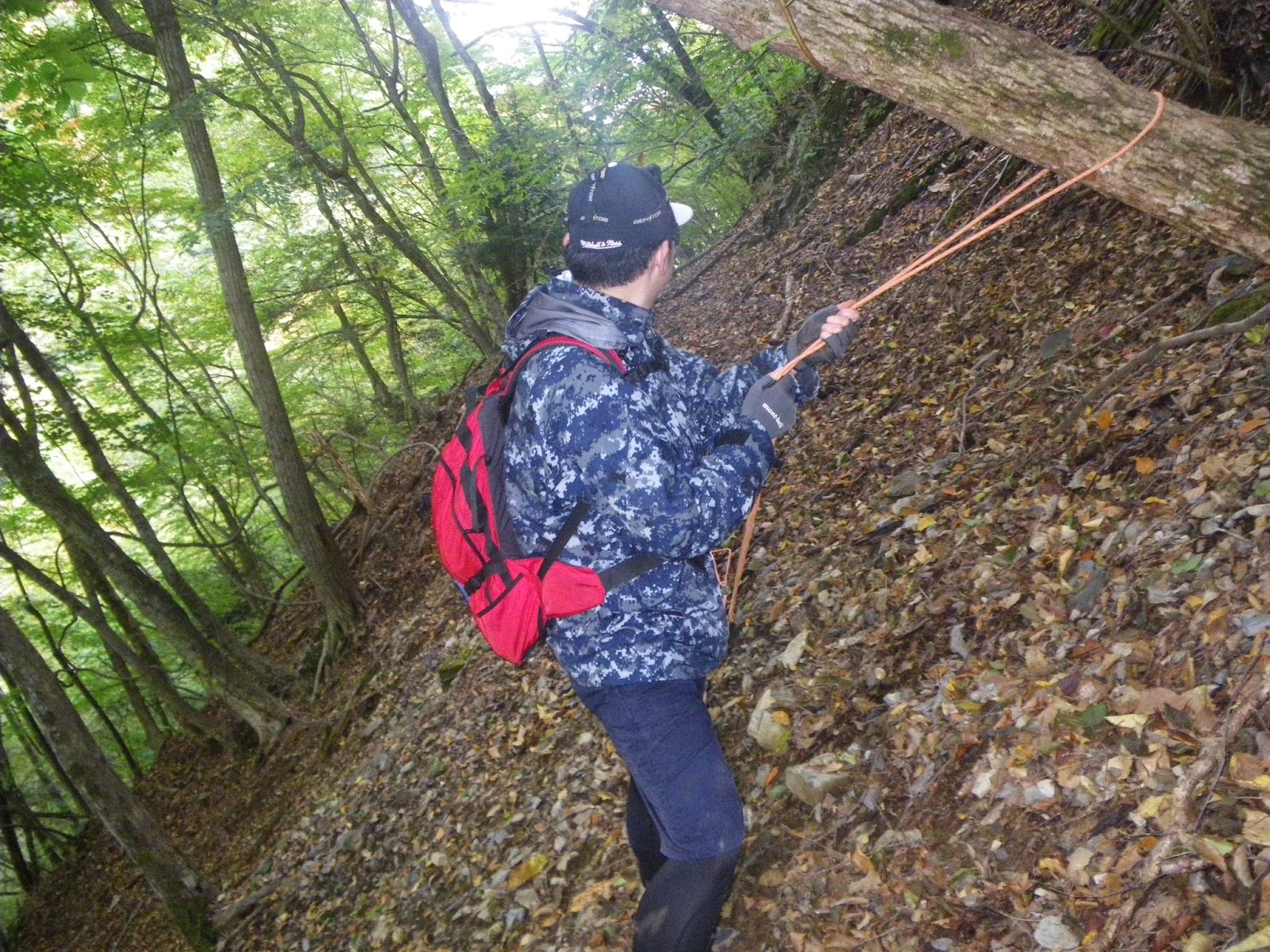 それにしても予想以上の崩壊道であった。山歩きのベテランのガイドが一緒でなければ、この廃道歩きはお勧めできない。万が一の安全の為にもロープ必須。10mロープ2本を、回収を容易にするため繋ぎ合わせ、木に廻したため10mの距離でのロープ確保となったが、10mではきちんとした支点確保ができないところもあり、身体を張っての確保といった危険な状況もあった(「デビュタント」が滑ったとき)。重いので敬遠していたが、30mのロープ一本買う時期かもしれない