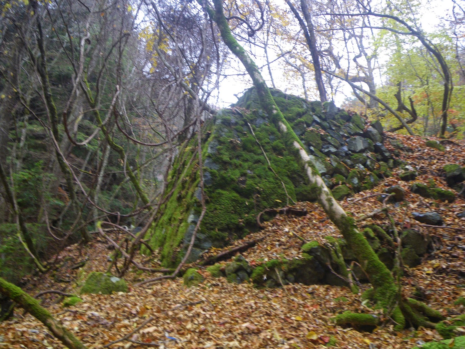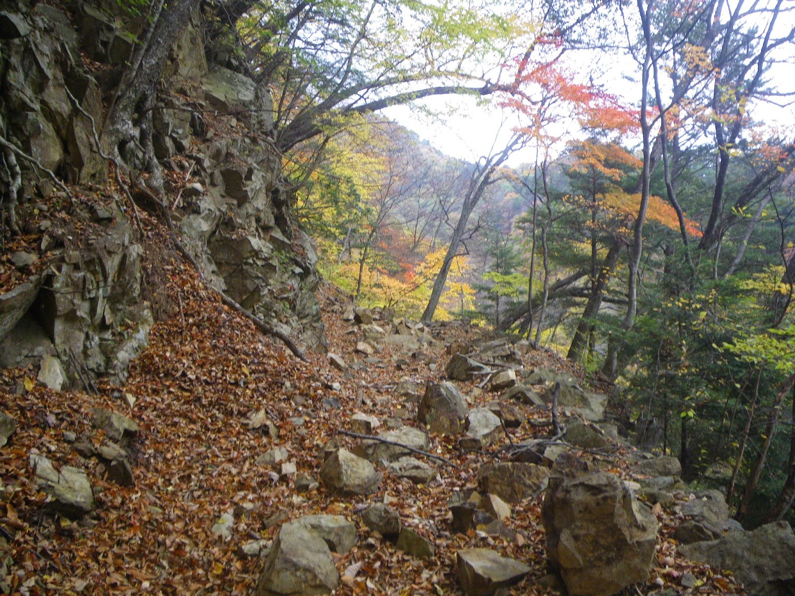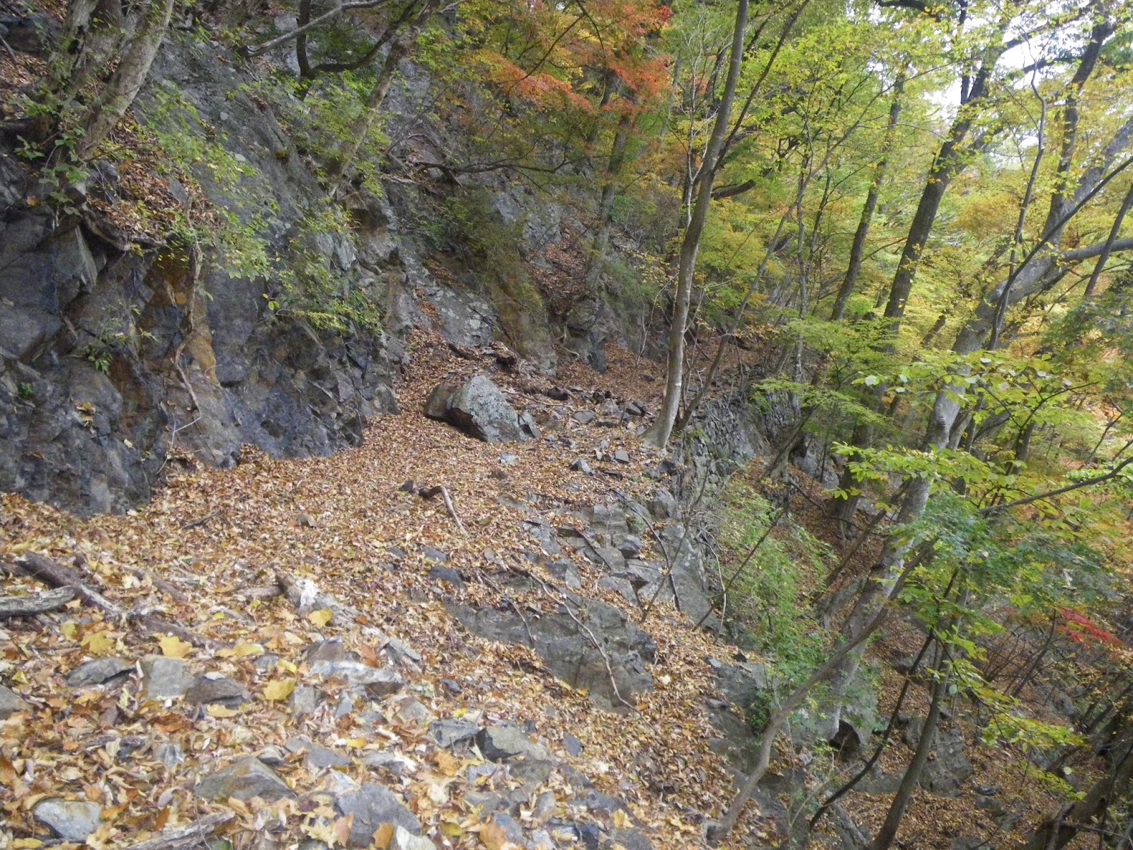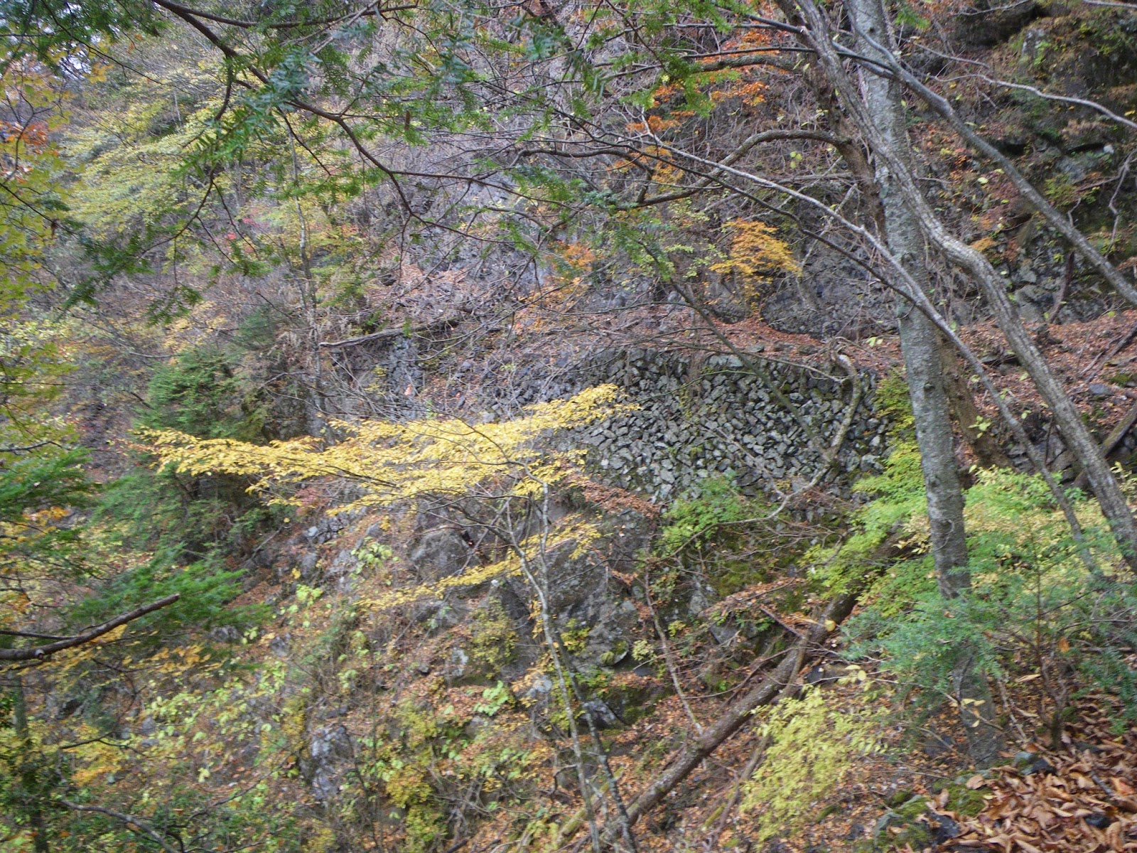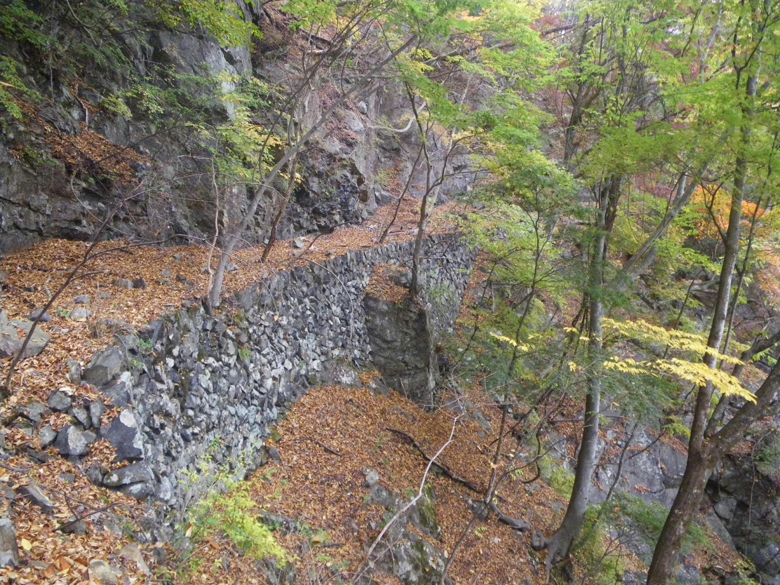石組みの道筋と紅葉のコンビネーションがなかなか、いい。道は900mの等高線を緩やかに上りながら進む。迂回先端部は標高930mほど。川床から150mほどの比高差はあるのだが、谷への傾斜が緩いため川筋から大分離れている。