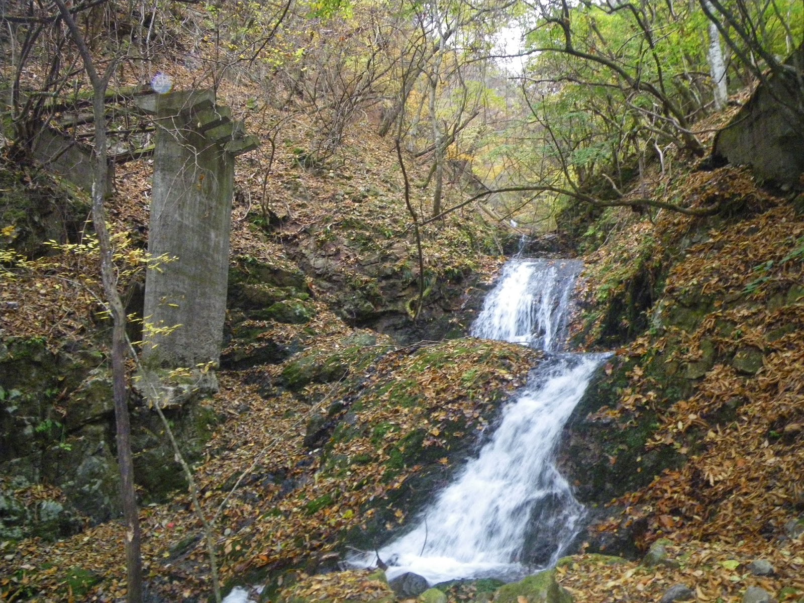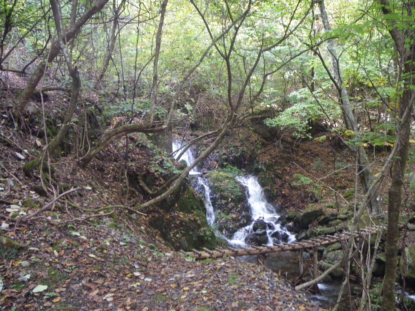 落石・ガレ場などを越えて泉水谷の入口から600mほどのところで突然広場が現れる。そしてその先に二段の滝が見える。滝脇にはコンクリート製の橋台跡が残る。明治の頃開かれた道に架けられた黒川橋の名残であろう。滝と風雪を経た橋台跡の組み合わは誠に美しい。