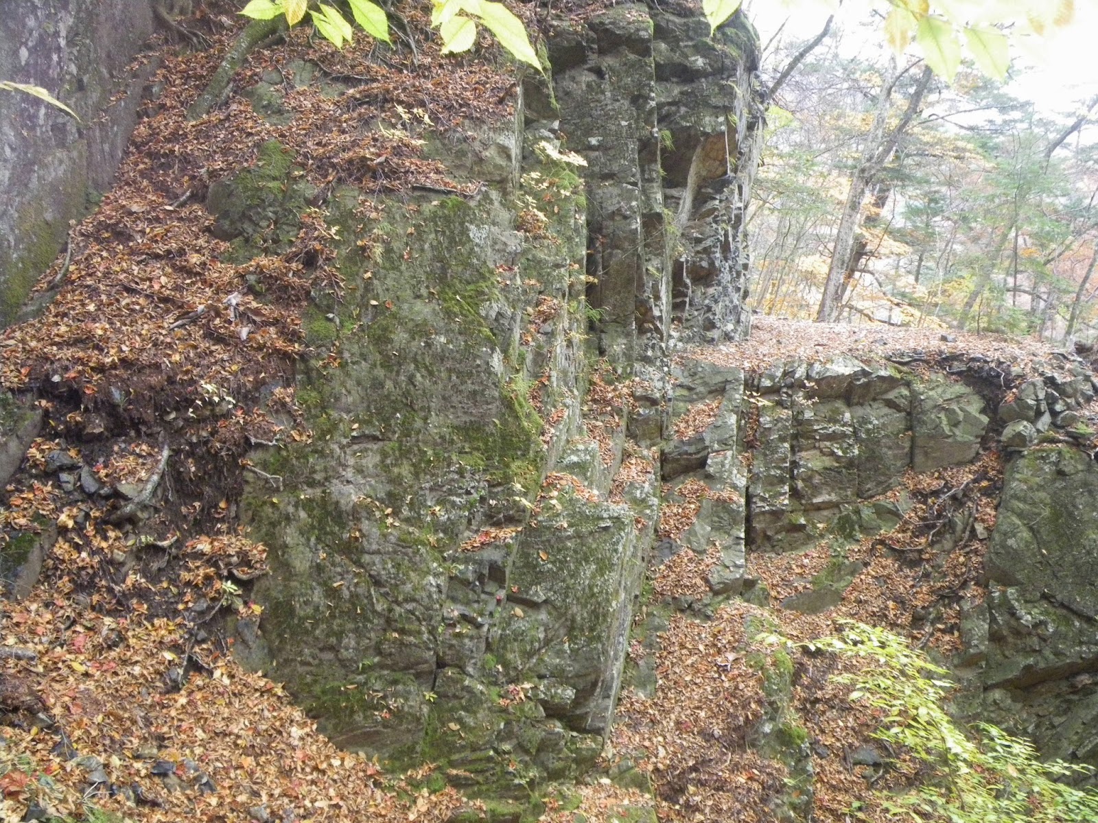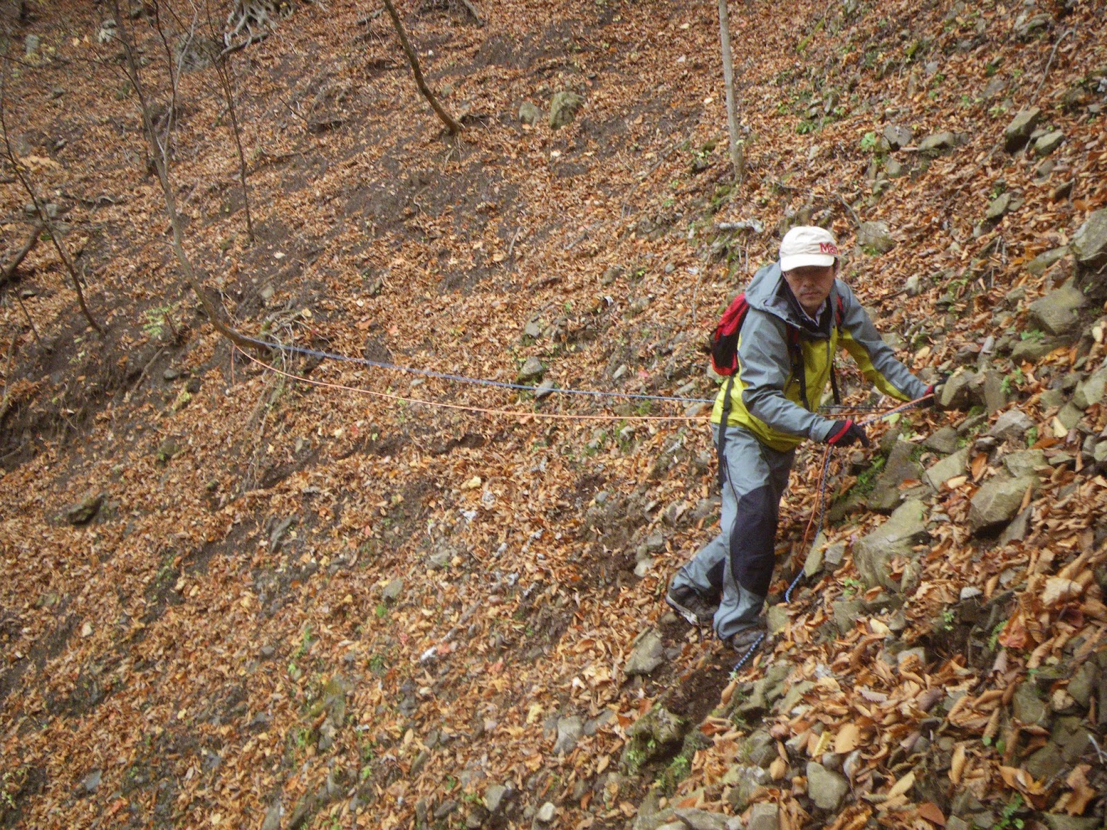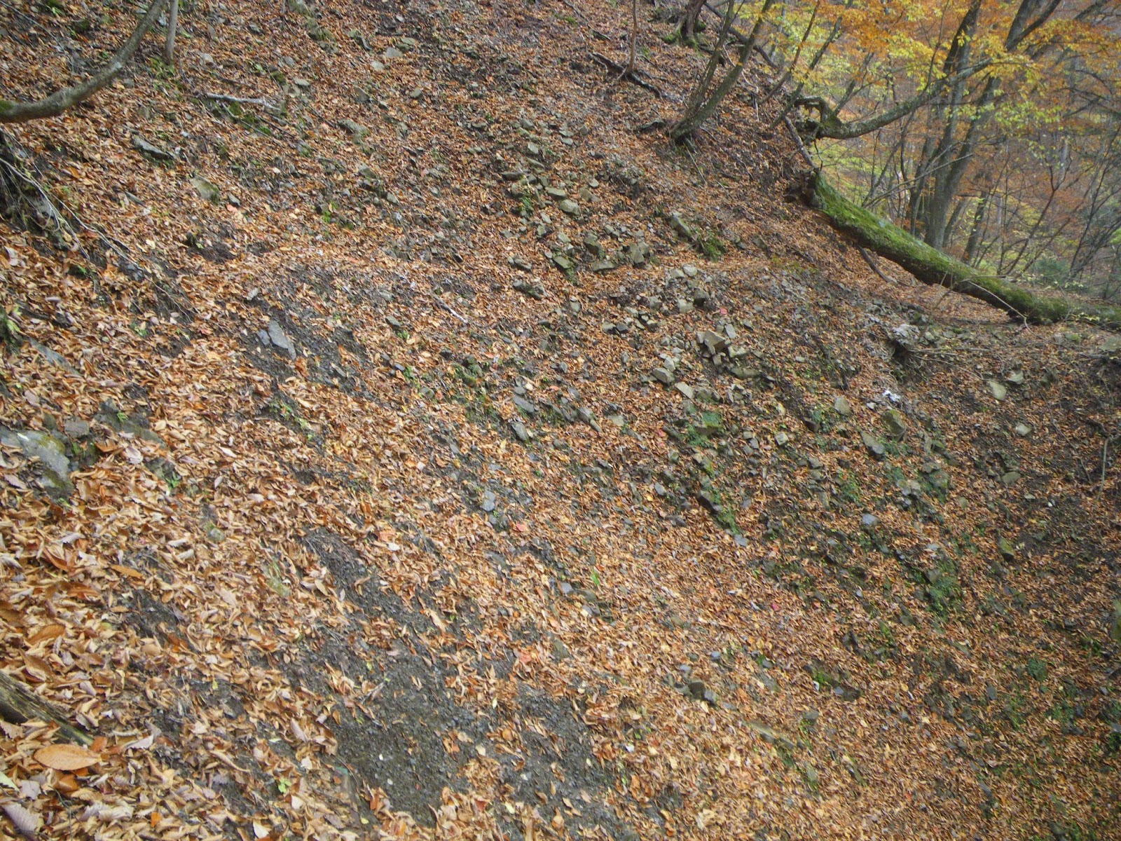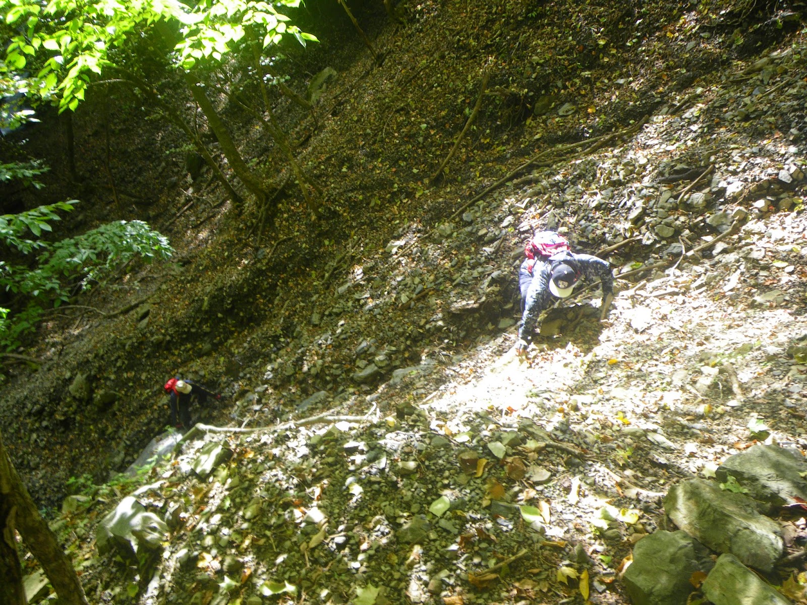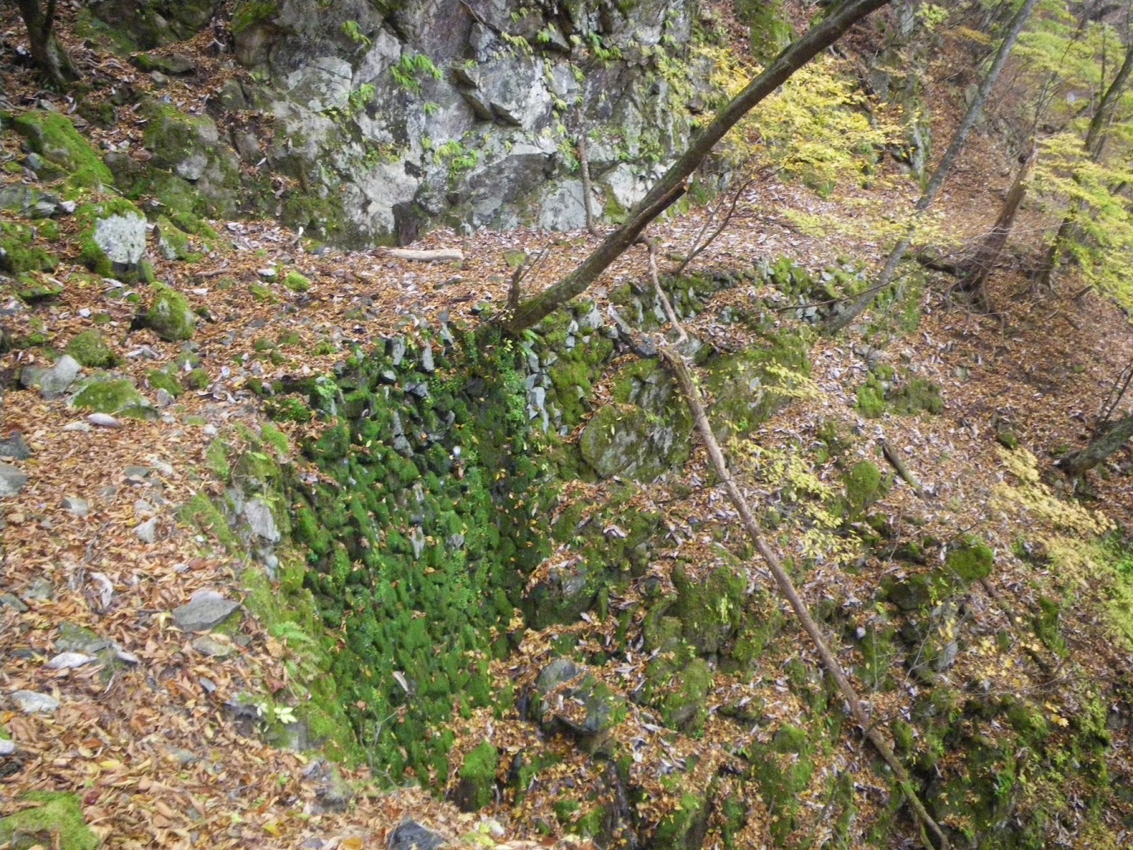 その上に石垣があることを確認し崖下を見ると、這い上がったところから少し下った辺りまで沢を下れば比較的傾斜の緩い崖となっている。パーティのSさんには沢を下ってもらいそこから登ってもらう。そこからは少し急ではあるが、足場がしっかりしている崖地をのぼり「黒川通り」に復帰した。