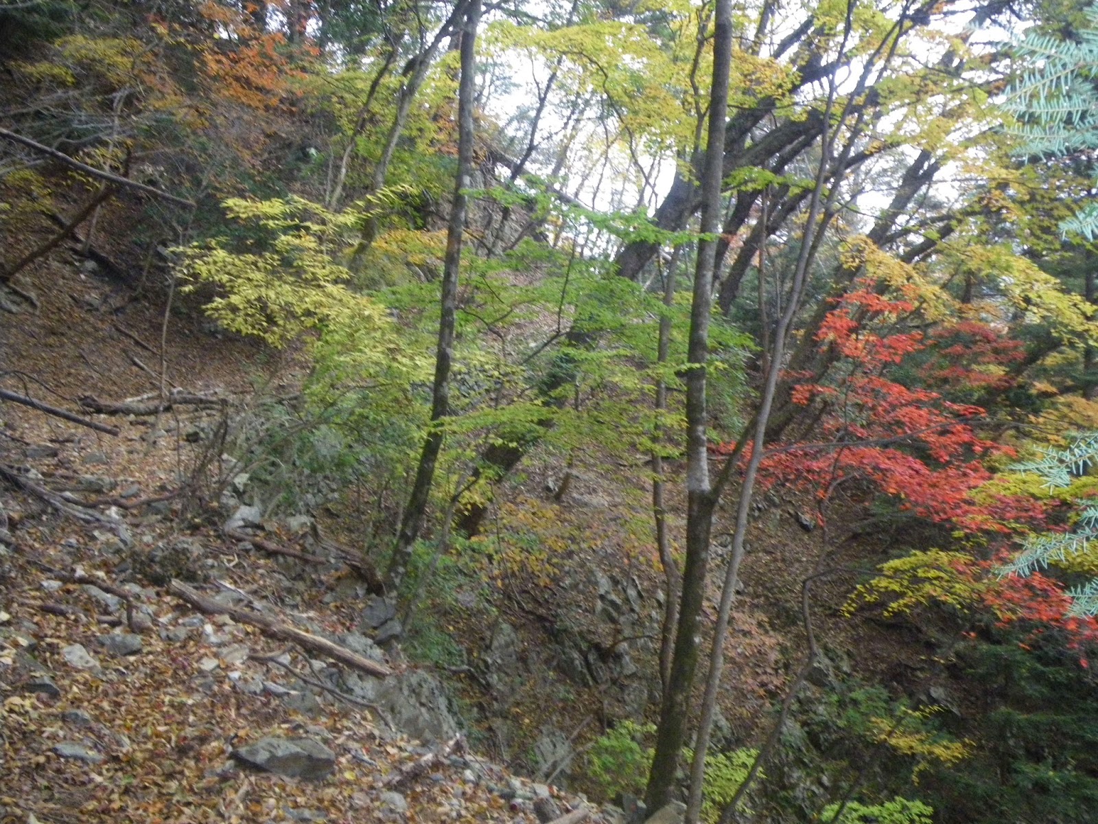 頃は紅葉の頃。「黒川通り」後半部は、先回の青梅街道散歩の時に撤退した黒川谷の辺り以外は崩壊箇所もないようでもあり、美しい紅葉を楽しみながら、などと出かけたのだが、これまた予想に反し結構厳しい散歩となった。不要だろうとは思いながらも持参したロープが有り難く思えた一日とはなった。