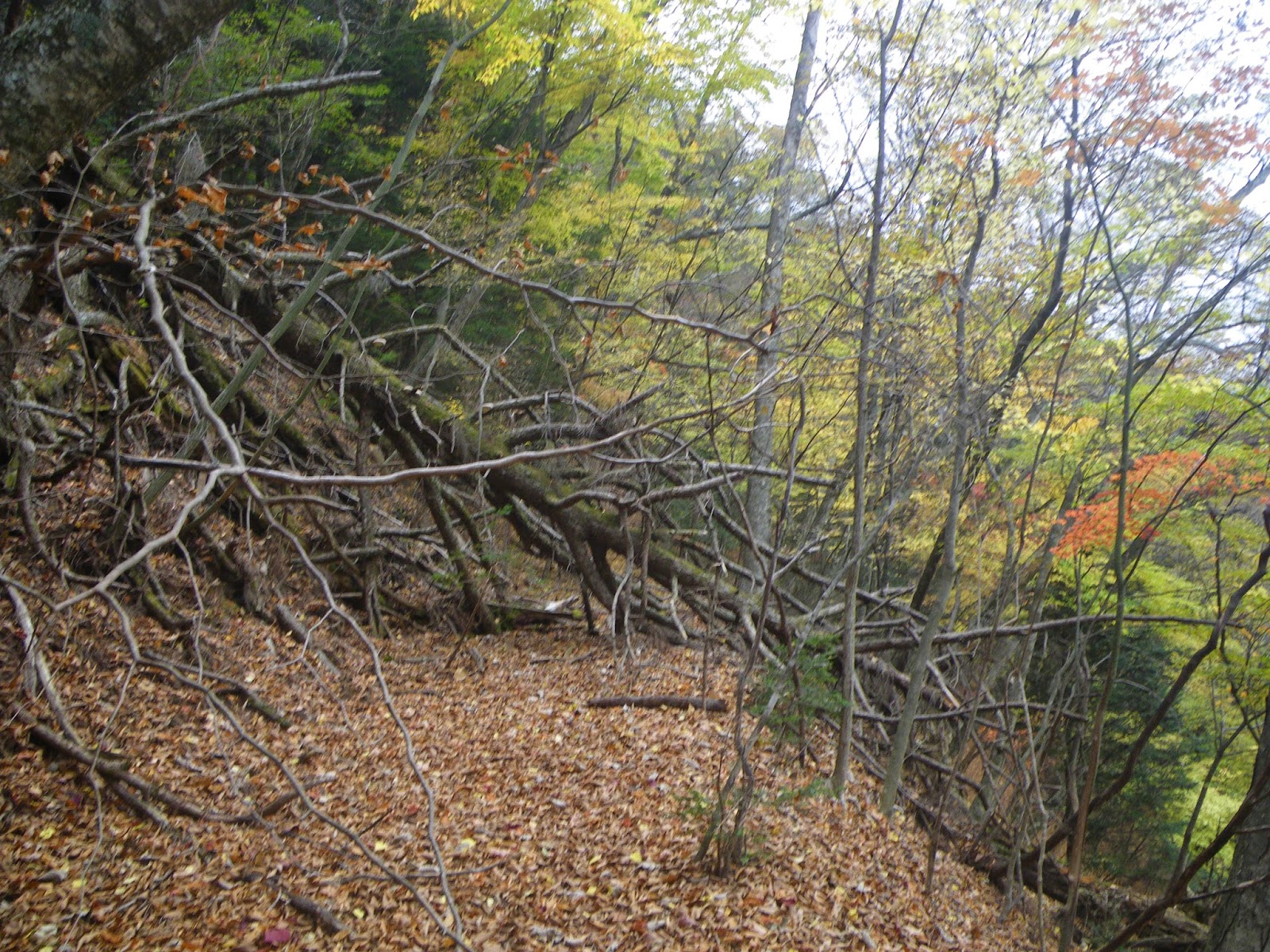 尾根先端部の迂回点から10分強で二つ目の崩壊箇所が現れた。足元は結構しっかりしているので、山側に重心をかけて慎重にガレ場を渡る。それにしても、谷筋からの比高差は200mほどあり、等高線も密であるので崖の傾斜は急であり、結構怖い。