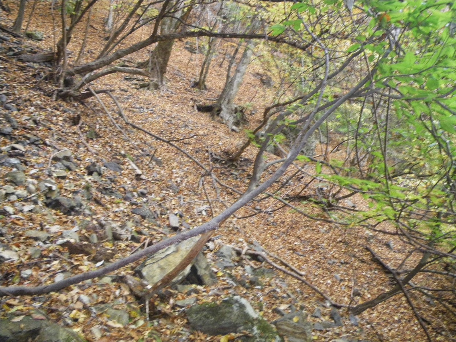 今回はこの崩壊箇所の先にある道筋を探すことからはじめる。崩壊箇所はガレ場をトラバースするのは砕石が足元から崩れ落ち、難しそう。結局谷筋を少し下り、山肌を注意しながら崩壊先の道跡を探すことに。