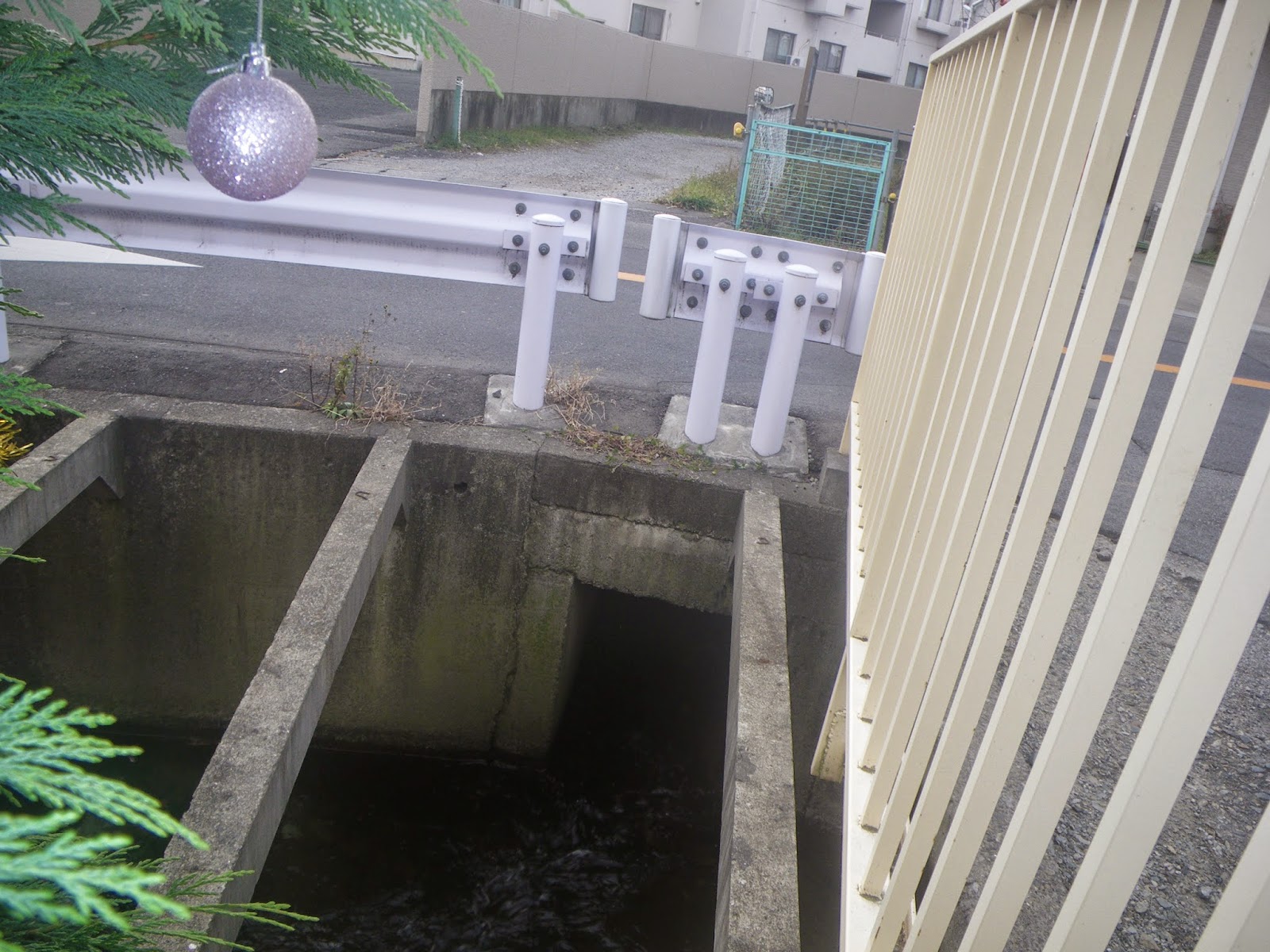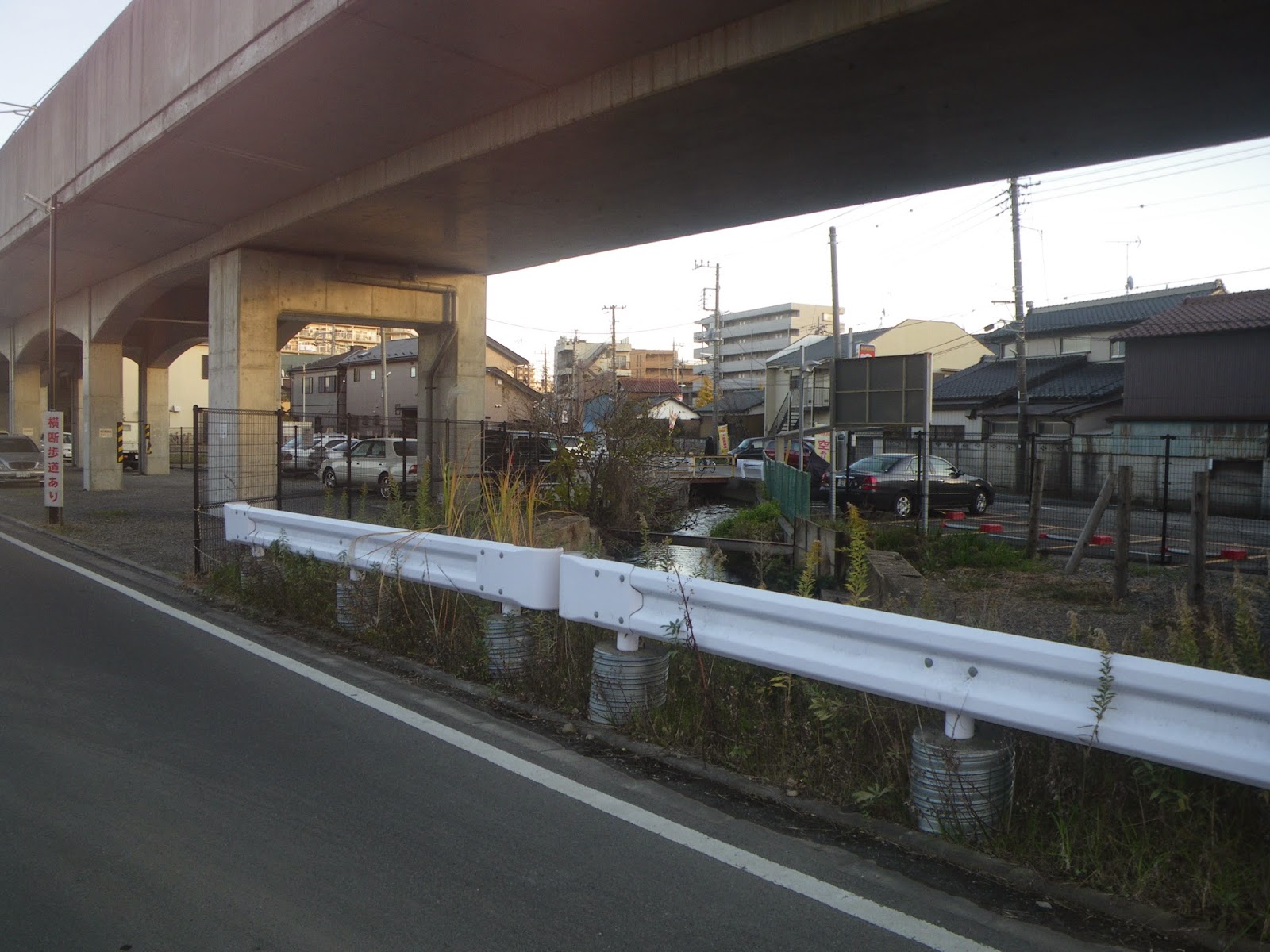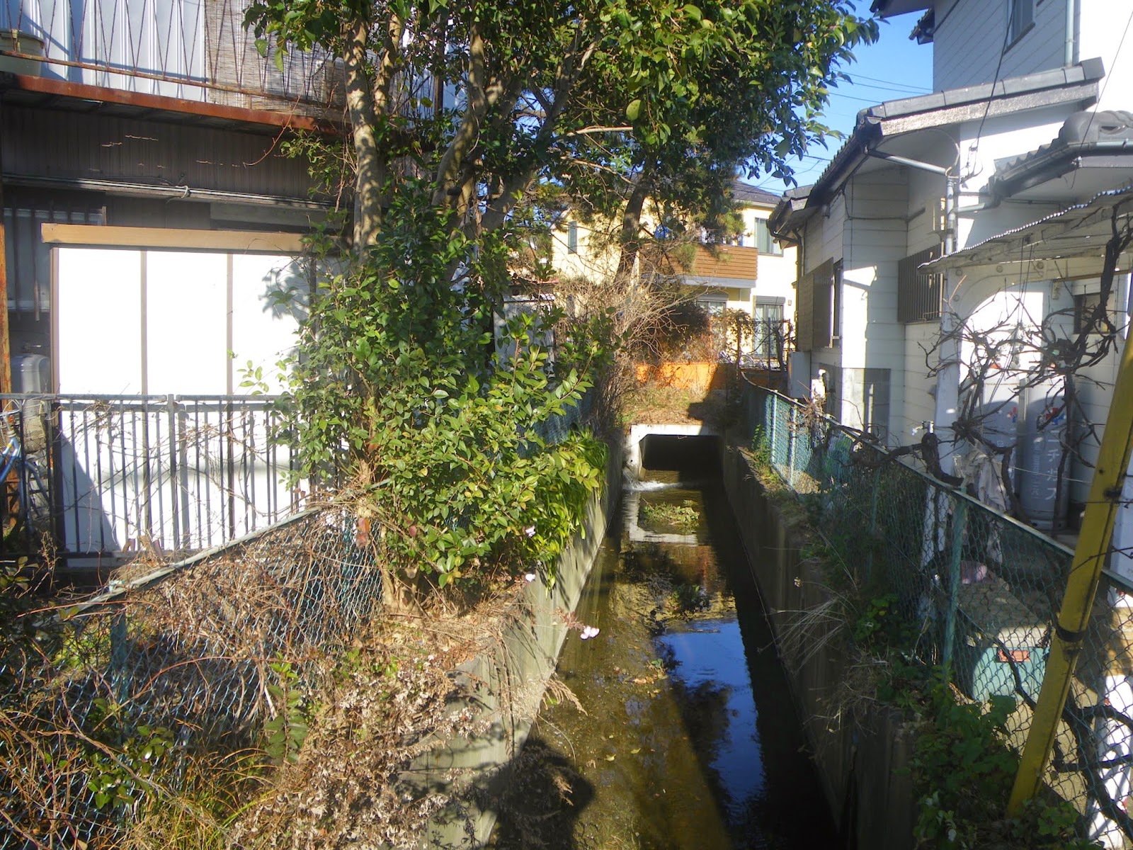 開渠となった水路は民家の間を縫って進む。水路に沿っては簡単に勧めない。行きつ戻りつを繰り返しながら先に進むと、都道9号バイパス手前で水路はコンクリートの蓋で覆われ、都道9号バイパスをコンクリートの箱形樋で渡る。