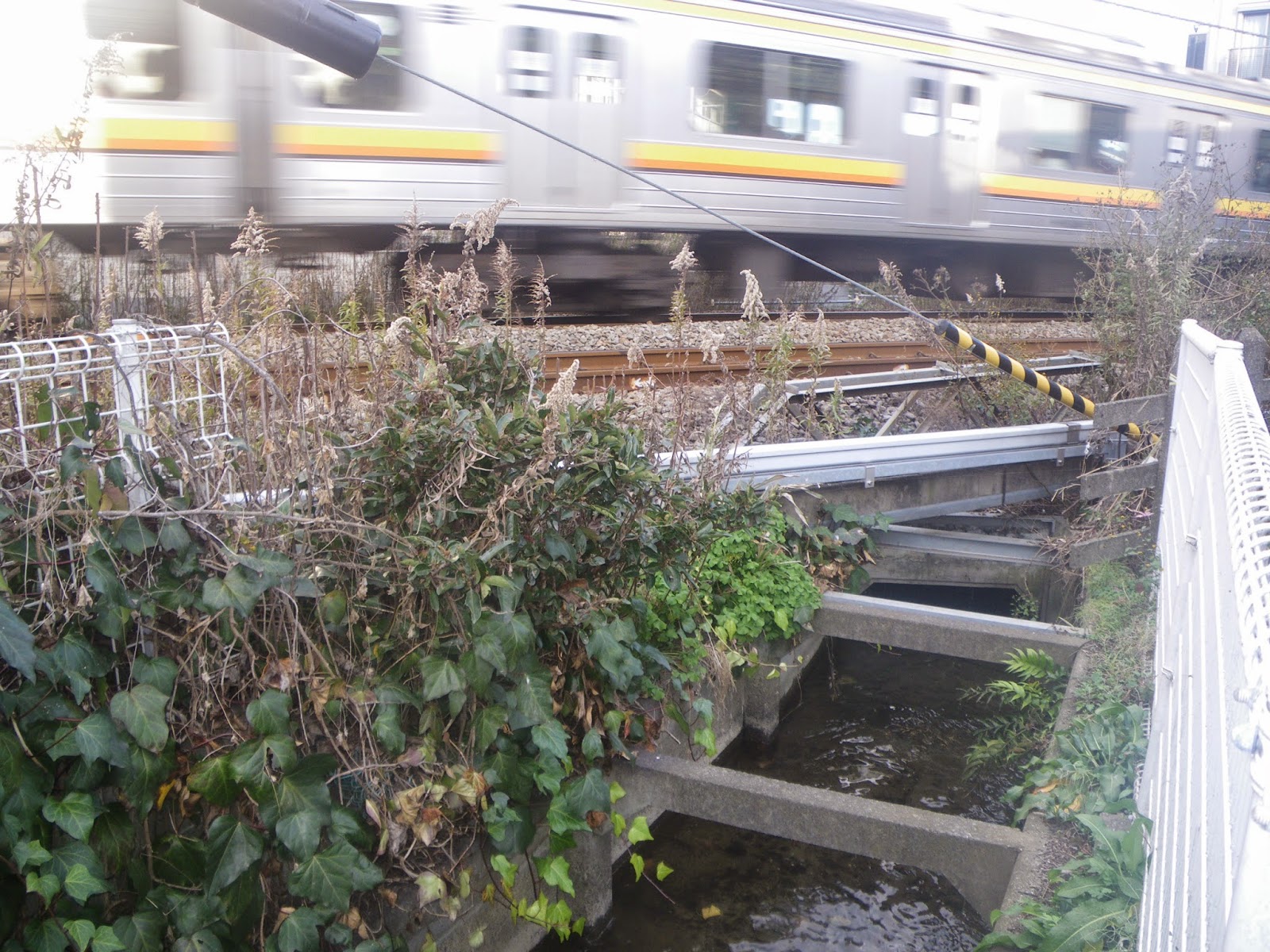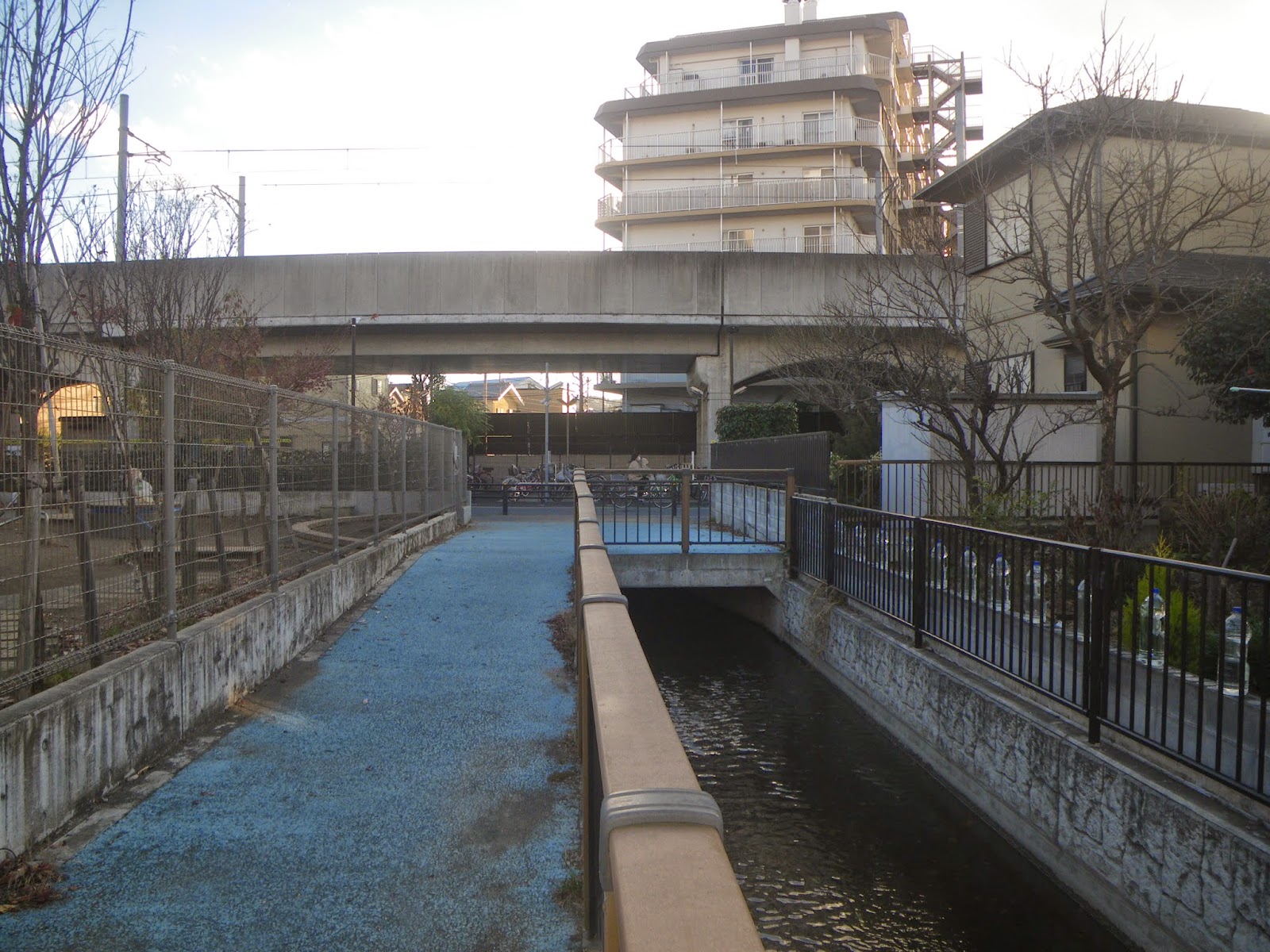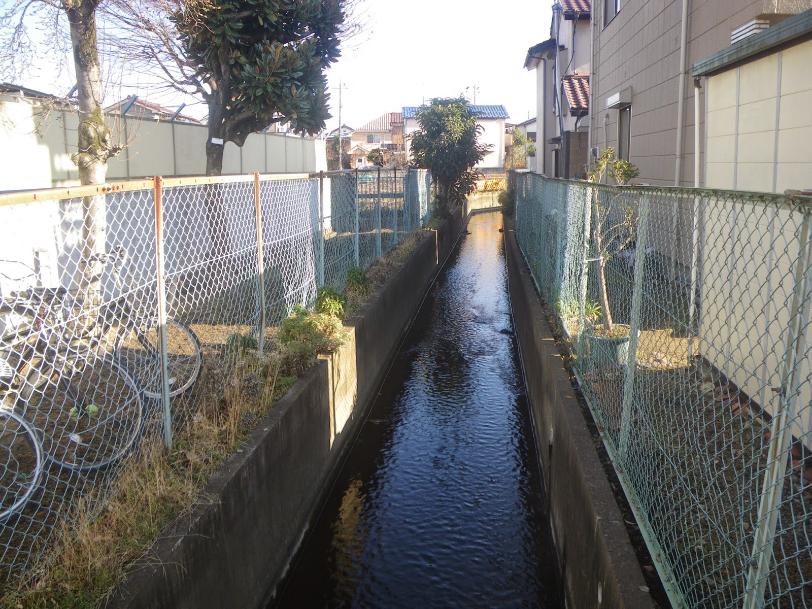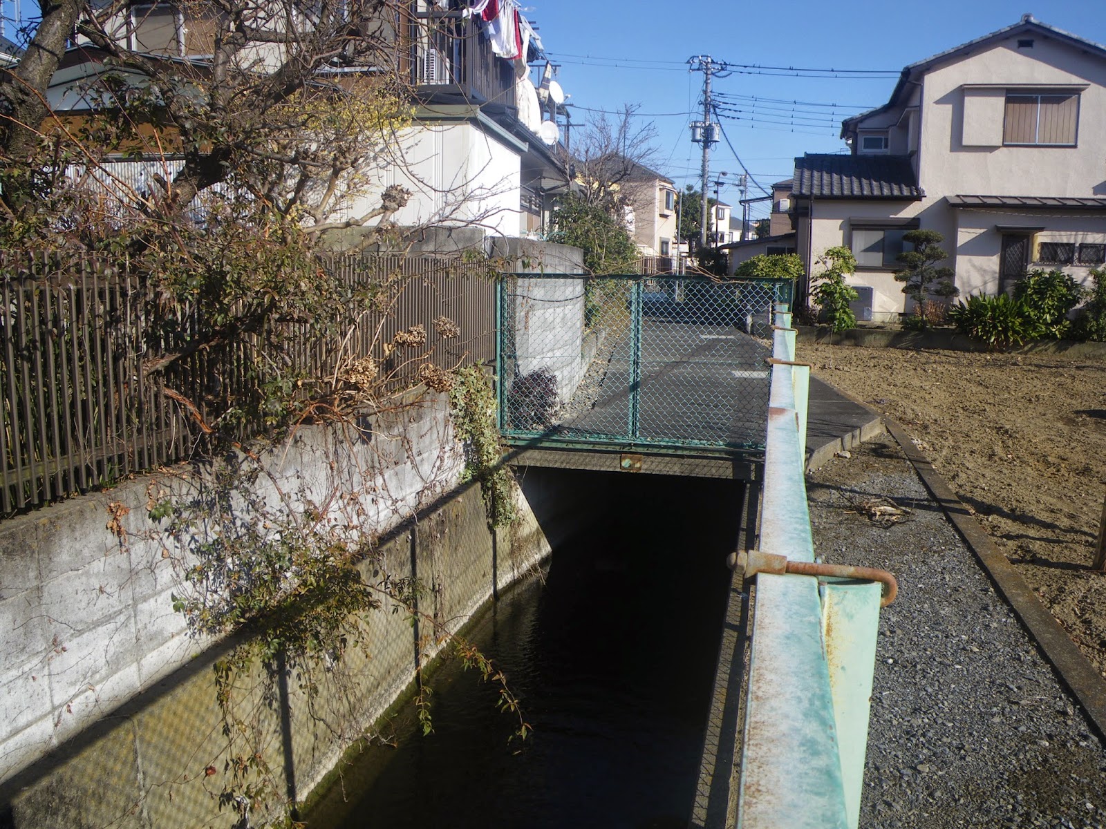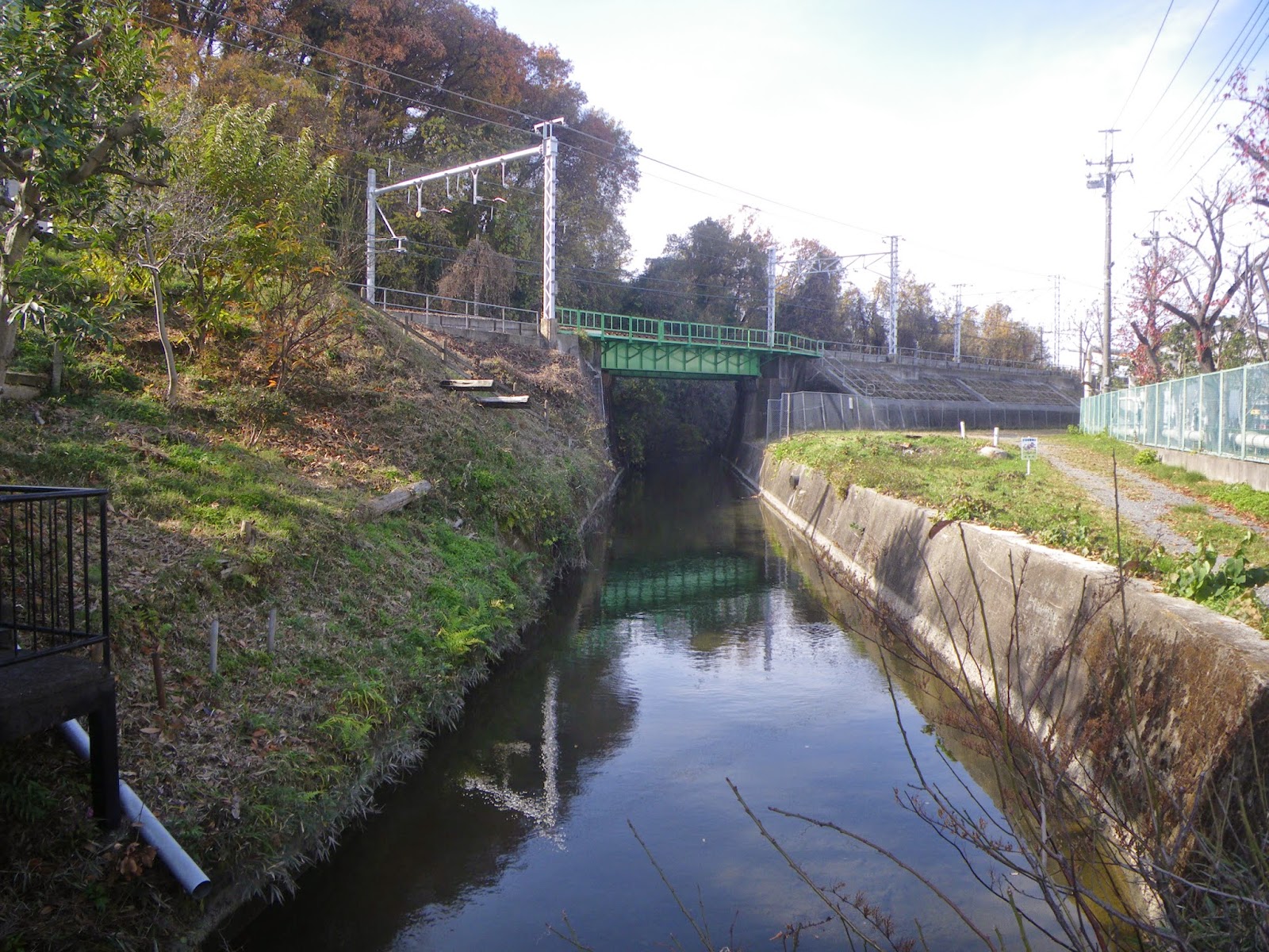 開渠となった水路は都市型の水路となり民家の間を南に下る。水路に沿って進むことはできないが、時に水路に延びる道があれば中に入り込み水路を確認しながら先に進むと前方に京王相模原線の高架が見えてくる。