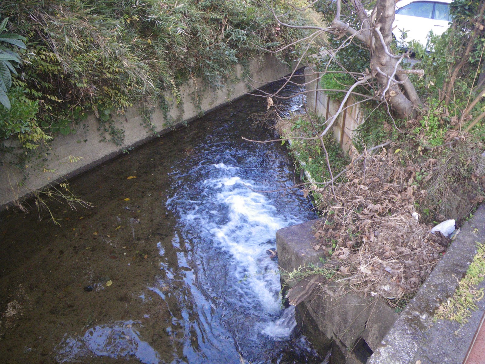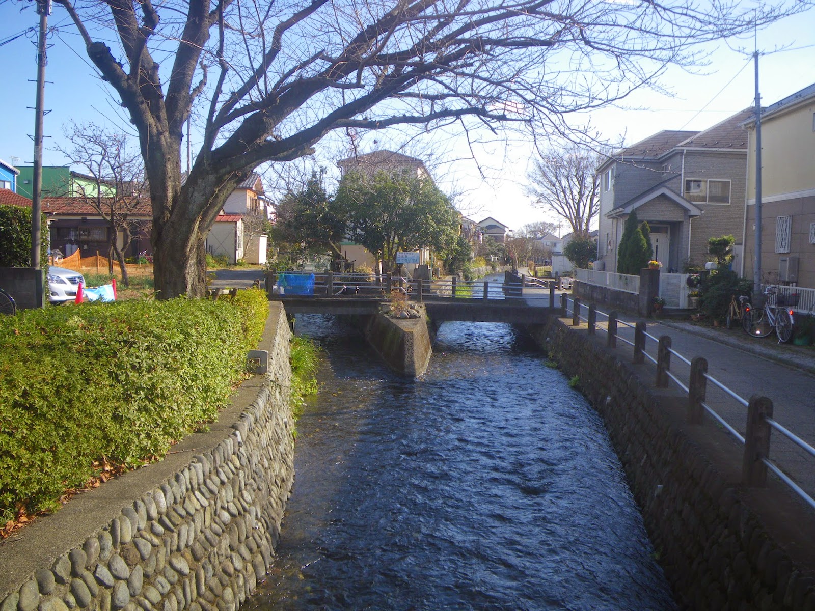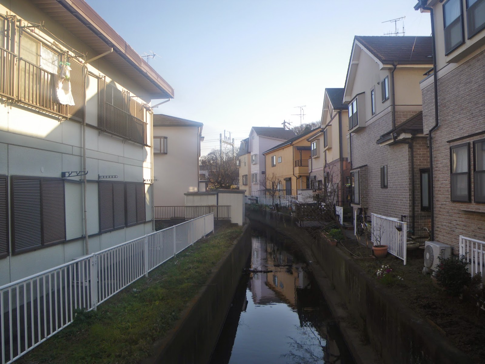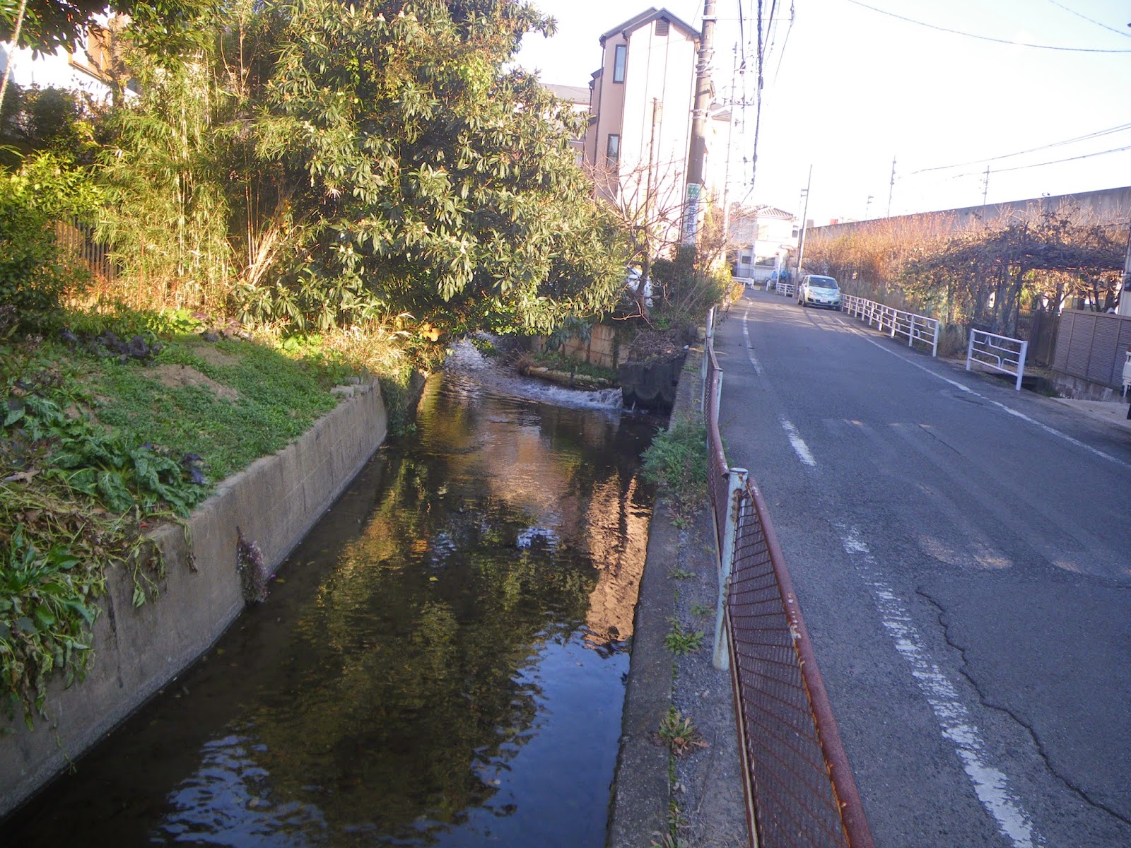 都道9号を越えた水路は開渠となり、南へ流れを変えて都道19号を越え、時に水路脇を辿れるとは言うものの、基本民家の間を縫って稲城第一小学校南へとくだってゆく。