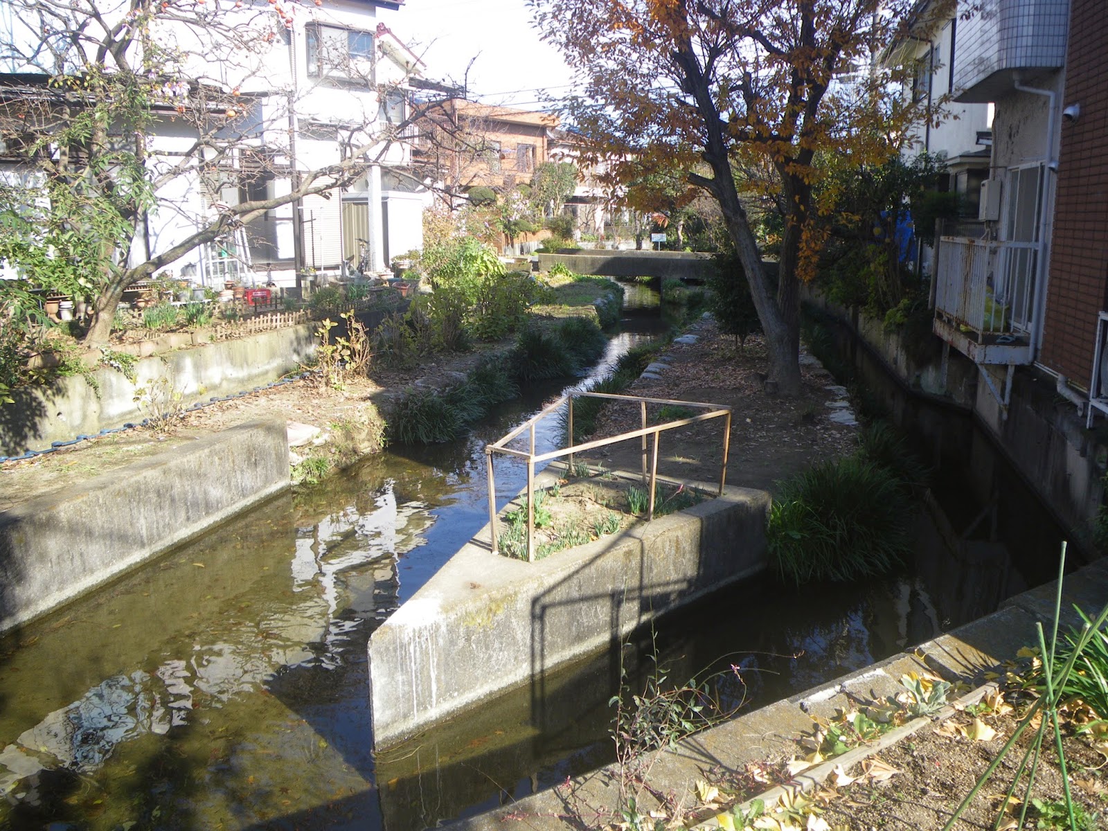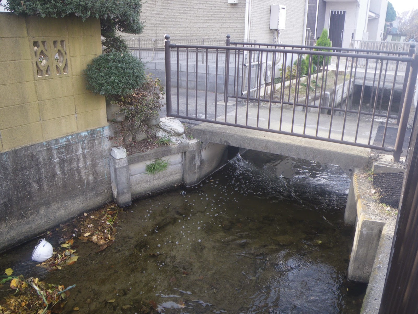 京王線を越えた水路は民家の間を南へ進む。水路に沿って進むことはできないため、水路に沿った道を進むが、水路を渡る小橋があると橋まで進み水路を確認。先に水門施設が見えてくる。成り行きで進み成り行きで右に折れると水門脇に出る。