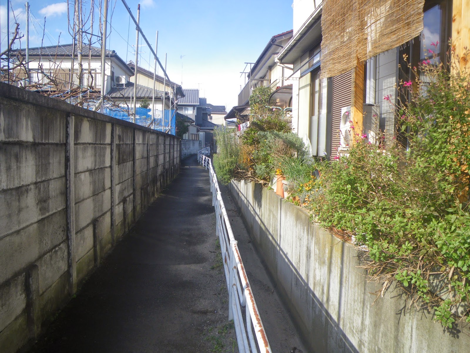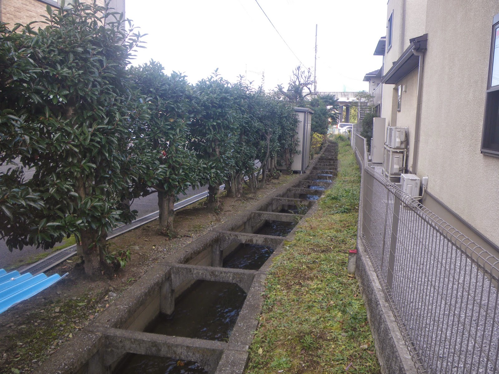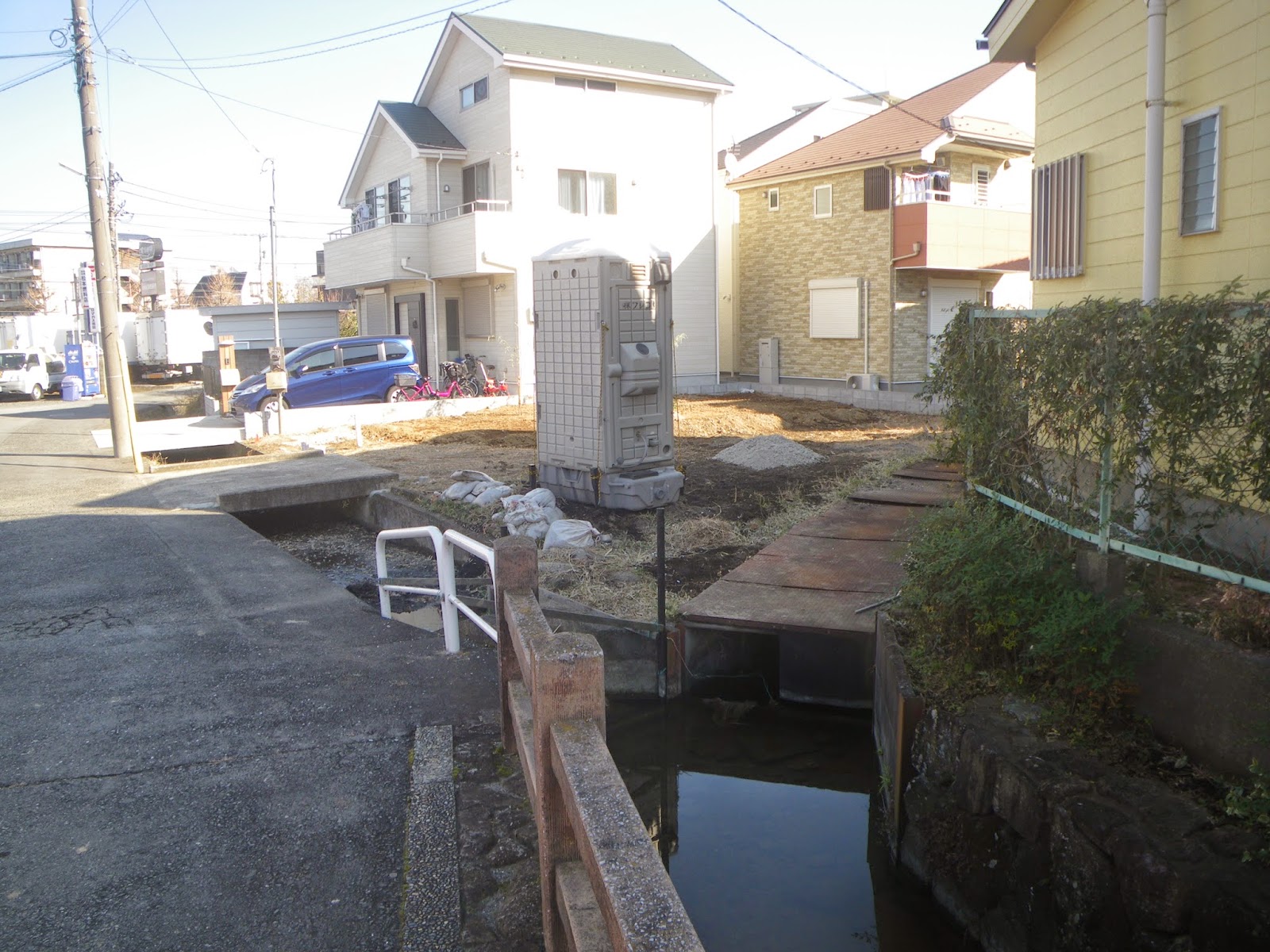 先に進むと、道が二つに分かれる辺りで一瞬暗渠となるが、道の左手に水路が見える。今までのきっちりした用水掘とは異なり、二手にわかれる左手の水路は宅地工事の影響の残る、雑とした雰囲気で民家の前を進む。一方、右に分かれる水路は上を鉄板で覆われ民家に間に入ってゆく。本流は右手に分かれた水路。左手に分かれた水路は「宿掘」である。