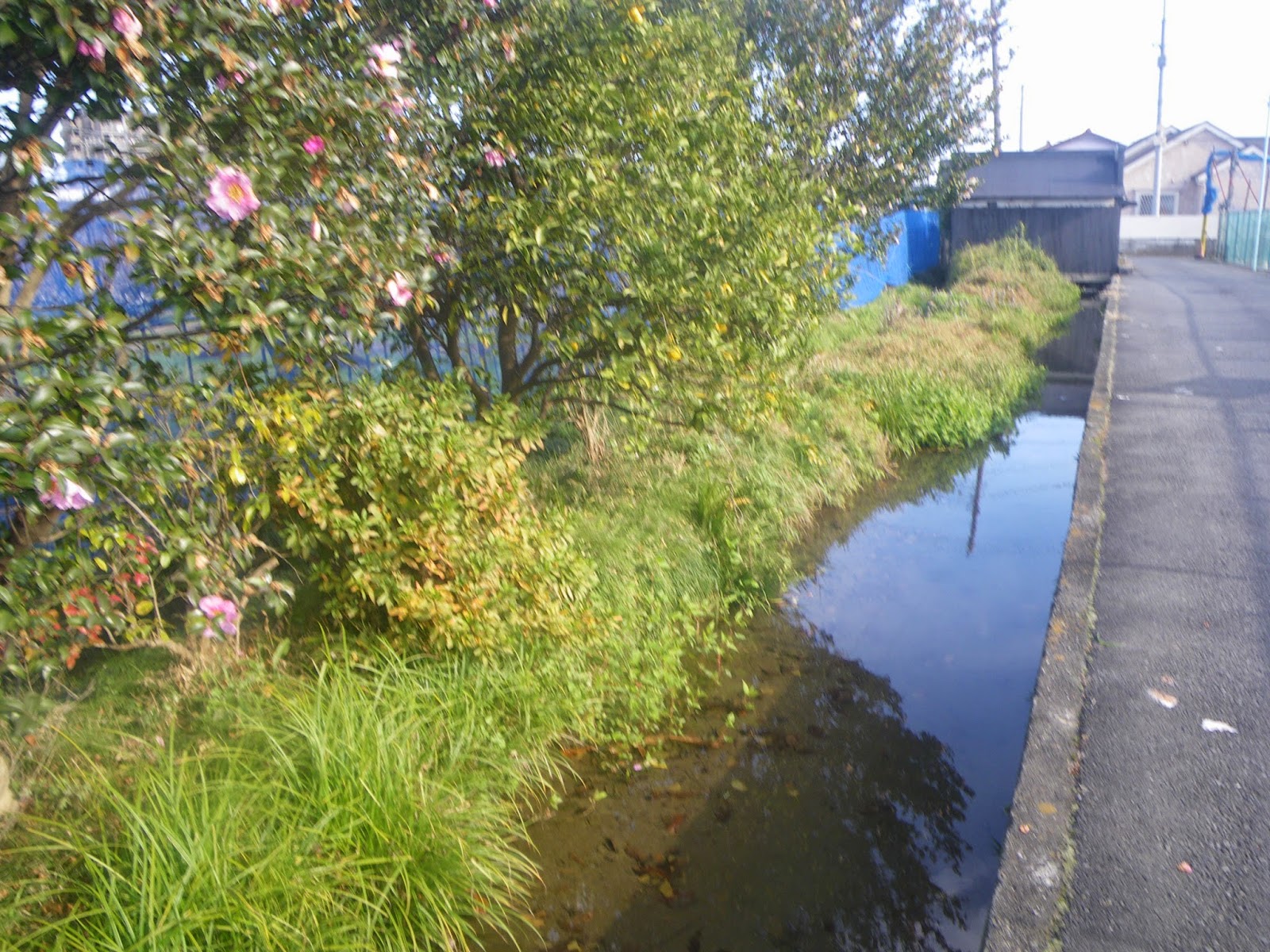細い水路を跨ぎ、「豊堀」が「大堀」に注ぐ箇所の写真を撮り、さてこれから先はどうしようと、少々悩む。再び反発力の大きい竹を折り敷き元の道に戻るか、「豊堀」の左手の畑を抜けて道にでるか、H鋼で補強された「大堀」のコンクリート護岸壁の上を進むかの三択。結局先に進めるかどうかの保証はないのだが、H鋼で補強された「大堀」に沿って進むことにした。幸運に成り行きで進むとっ水路は道路に辺り、道に復帰できた。