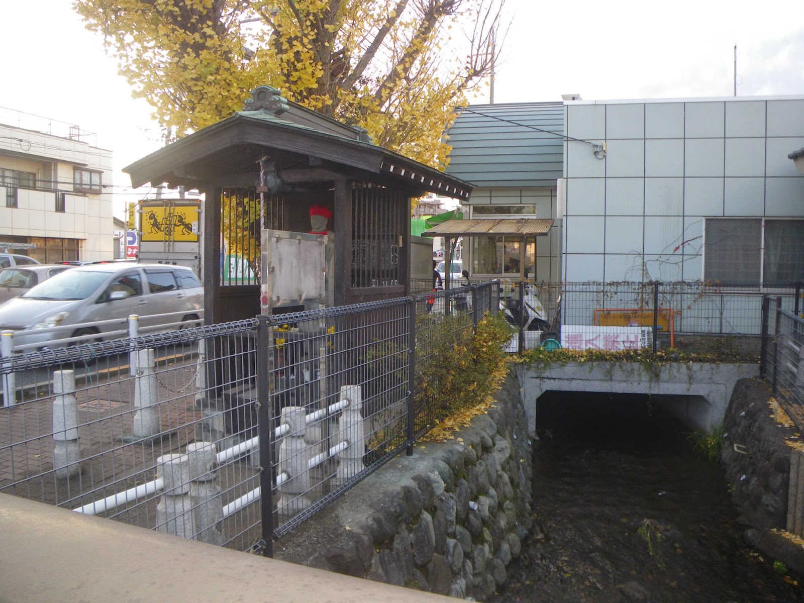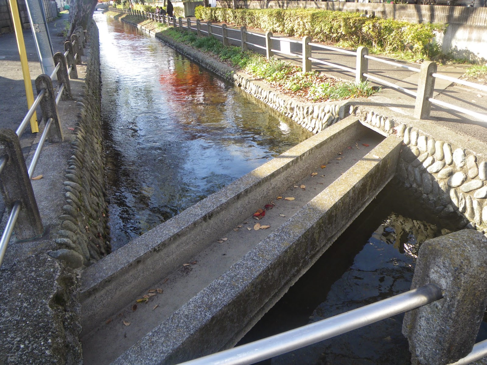 都道9号の大丸交差点辺りで水路を探すと、交差点の少し西に水路が顔を出している。交差点を渡り、水路に沿って進む。結構雰囲気のいい用水の景観を呈する。