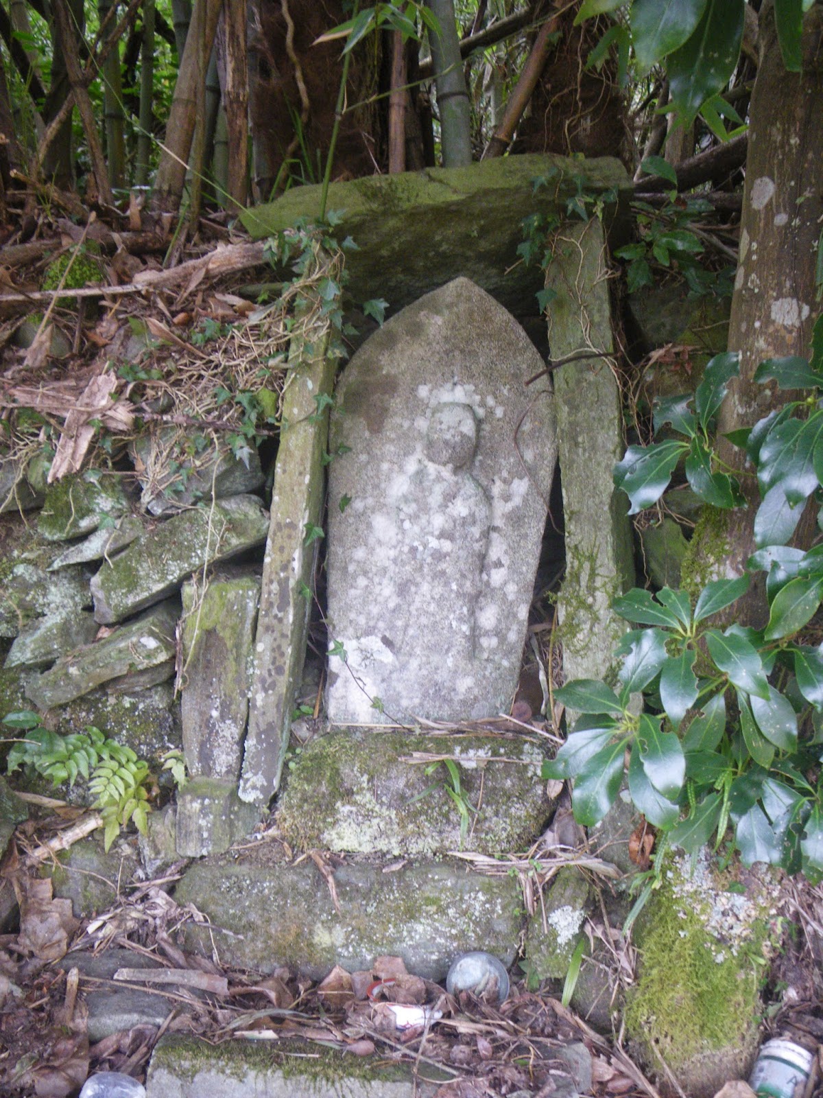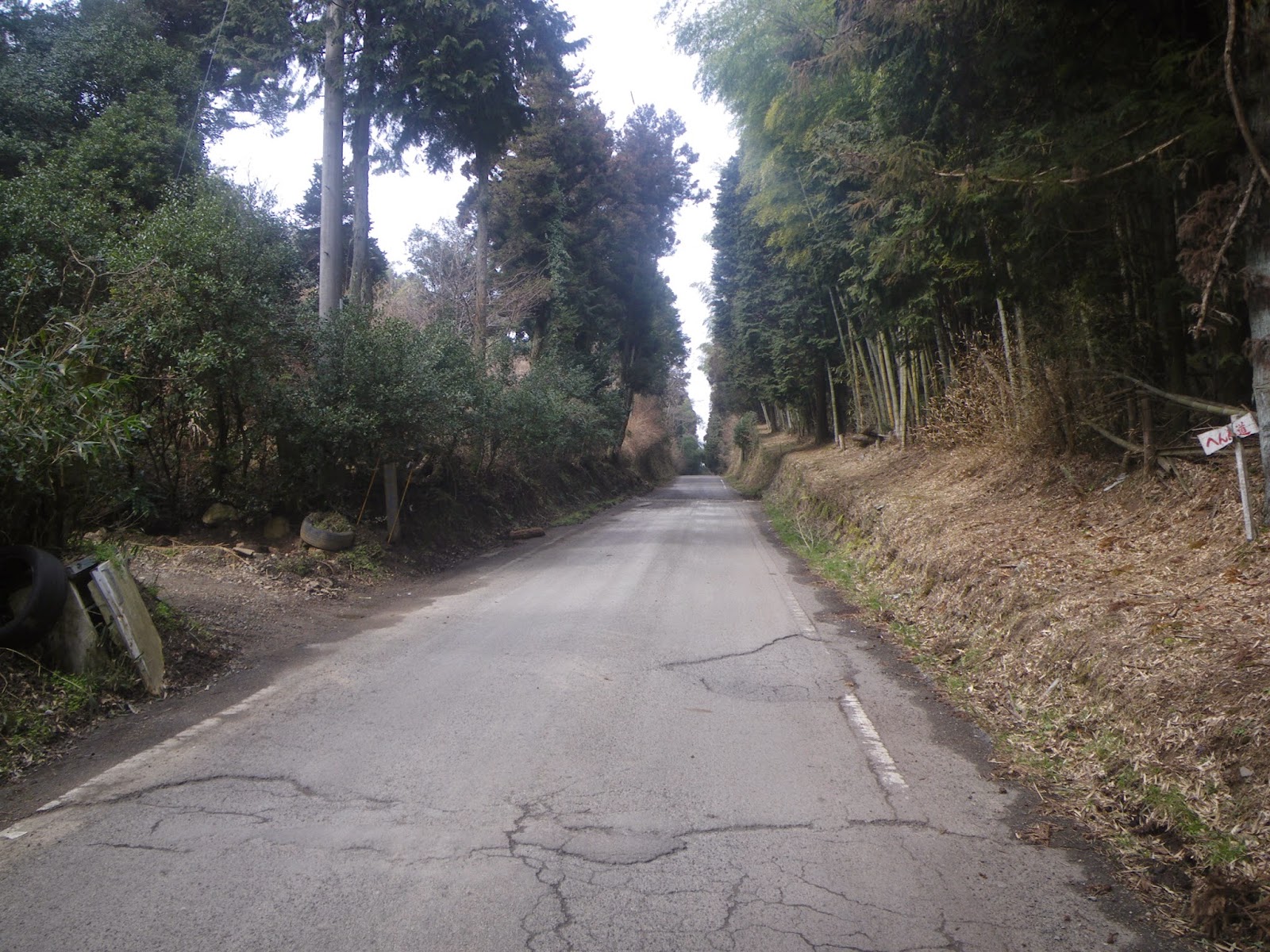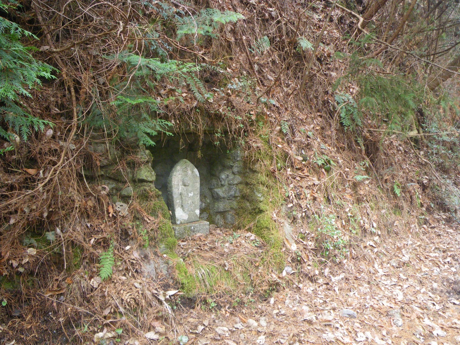 峠近くに小関加圧ポンプ場。通常標高の高い配水池に水を導送水するため加圧する施設。配水池でもあるのだろうか、などと思いながら先に進み峠に到着。特に標識はないが、二体のお地蔵様が祀られる祠が峠かと思われる。この祠は「峠の地蔵さん」として地元の人たちが平成元年に別の地にあったお地蔵様をこの地に移し祠を建てた、とか。